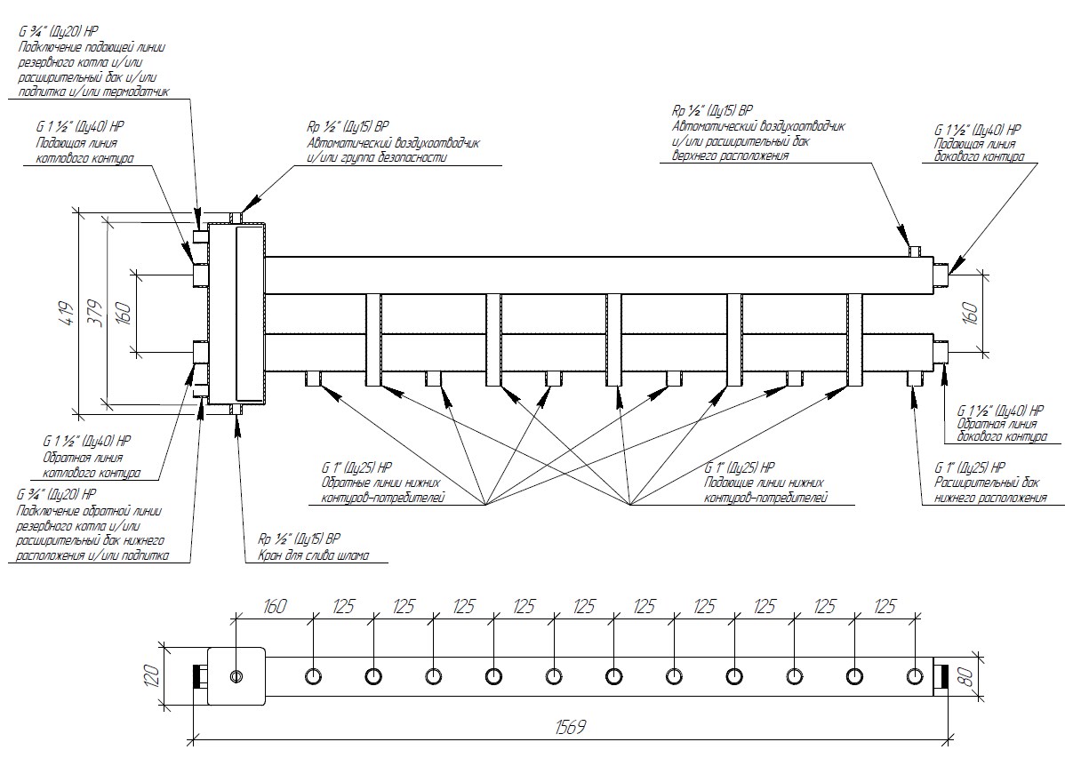 Коллектор с гидрострелкой (балансировочный коллектор) применяется в системах отопления до 1200 м(2) для соединения одного или нескольких котлов с шестью потребителями (в конфигурации 5+1).