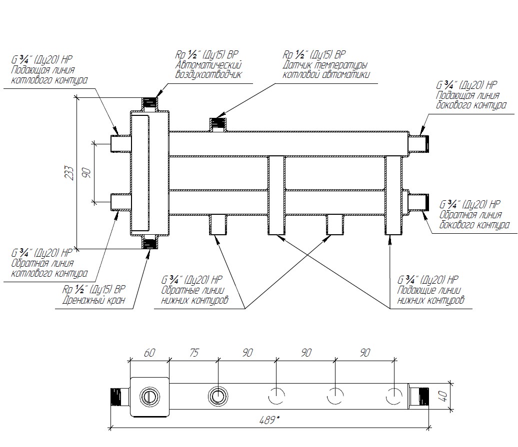 Нержавеющая гидрострелка на 2 -3 контура для настенного котла (балансировочный коллектор в конфигурации 2+1) предназначена для энергоэффективной гидрообвязки котельной одноэтажного частного дома до 250 м(2) .