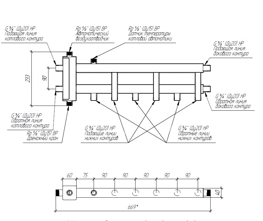 Нержавеющая гидрострелка на 4 контура для настенного котла (балансировочный коллектор в конфигурации 3+1) предназначена для энергоэффективной гидрообвязки котельной одноэтажного дома до 250 м(2) .