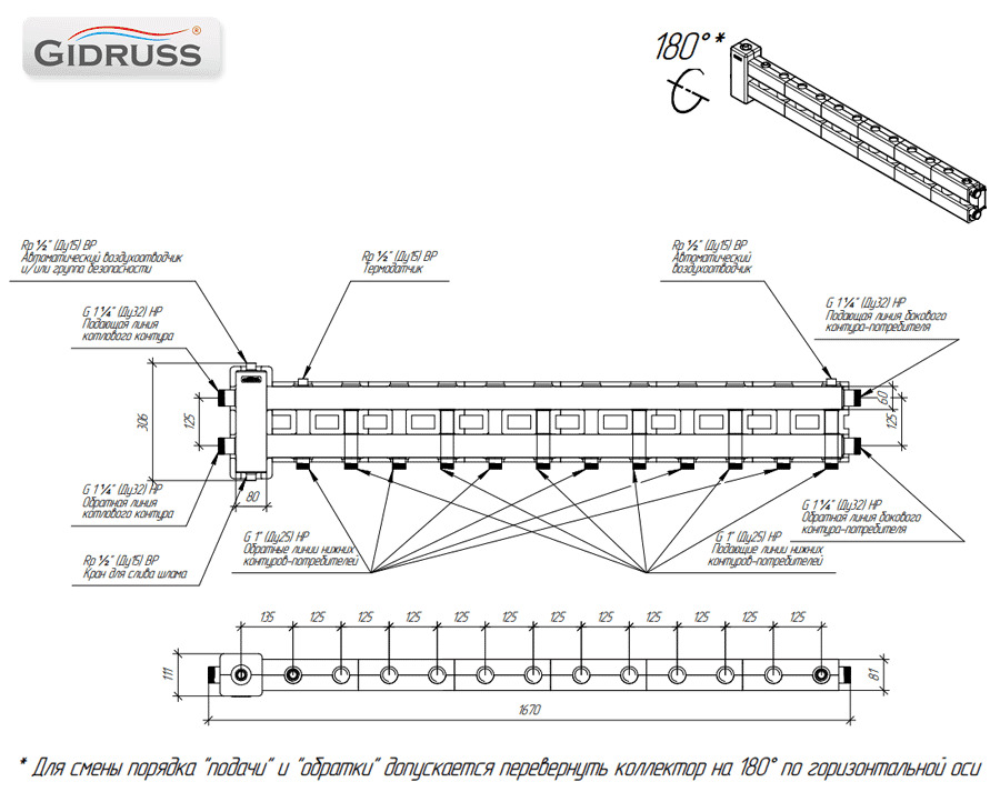 Коллектор балансировочный Gidruss BMSS-80-7D.EPP (до 80 кВт, подкл. котла G 1 1/4", 6 контуров G 1", боковой контур G 1 1/4", 4D-кронштейны K.UMS, EPP