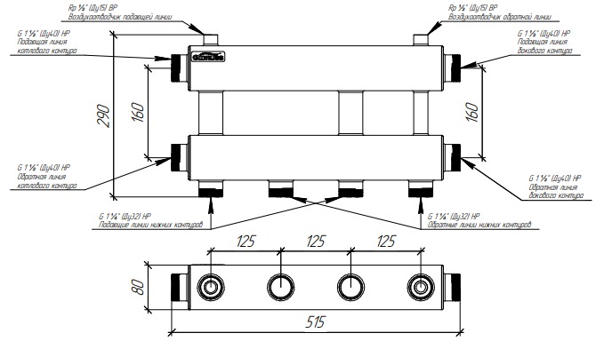 Коллектор модульный Gidruss MK-150-2x32 (до 150 кВт, 2 магистр. подкл. G 1 1/2", 2 контура G 1 1/4" вверх или вниз, ст. 09Г2С)