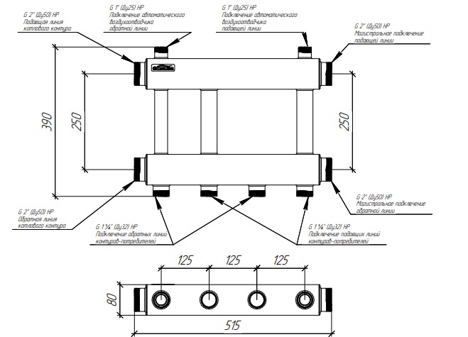 Коллектор модульный Gidruss MK-250-2x32 (до 250 кВт, 2 магистр. подкл. G 2", 2 контура G 1 1/4" вверх или вниз, ст. 09Г2С)