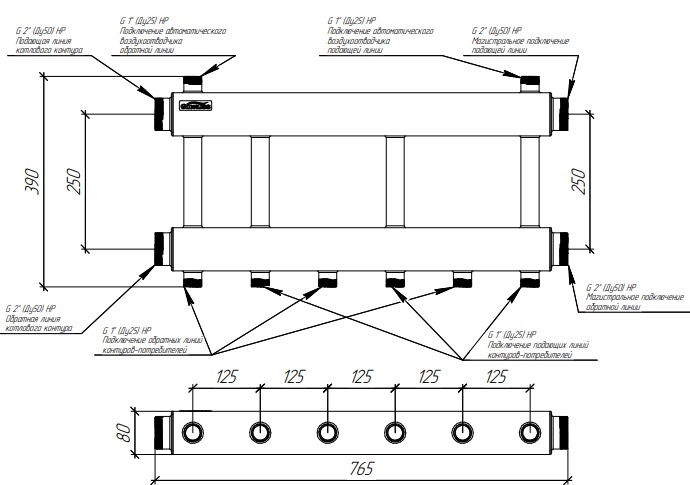 Коллектор модульный Gidruss MK-250-3x25 (до 250 кВт, 2 магистр. подкл. G 2", 3 контура G 1" вверх или вниз, ст. 09Г2С)