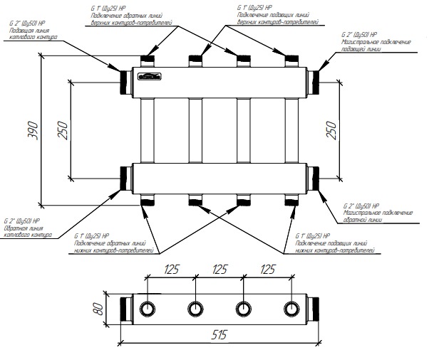 Коллектор модульный Gidruss MK-250-4DU (до 250 кВт, 2 магистр. подкл. G 2", 2 контура G 1" вверх и 2 вниз, ст. 09Г2С)