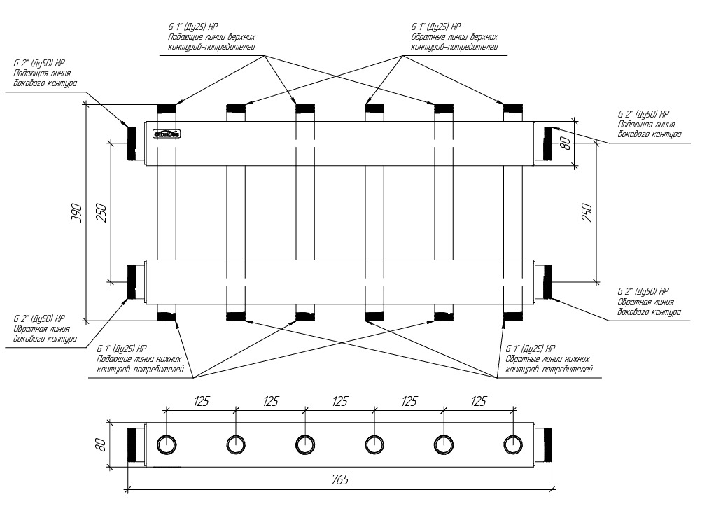 Модульный коллектор MK-250-6DU предназначен для распределения теплоносителя по контурам или его сбора в каскад для вывода на гидравлический разделитель GR-250-50.