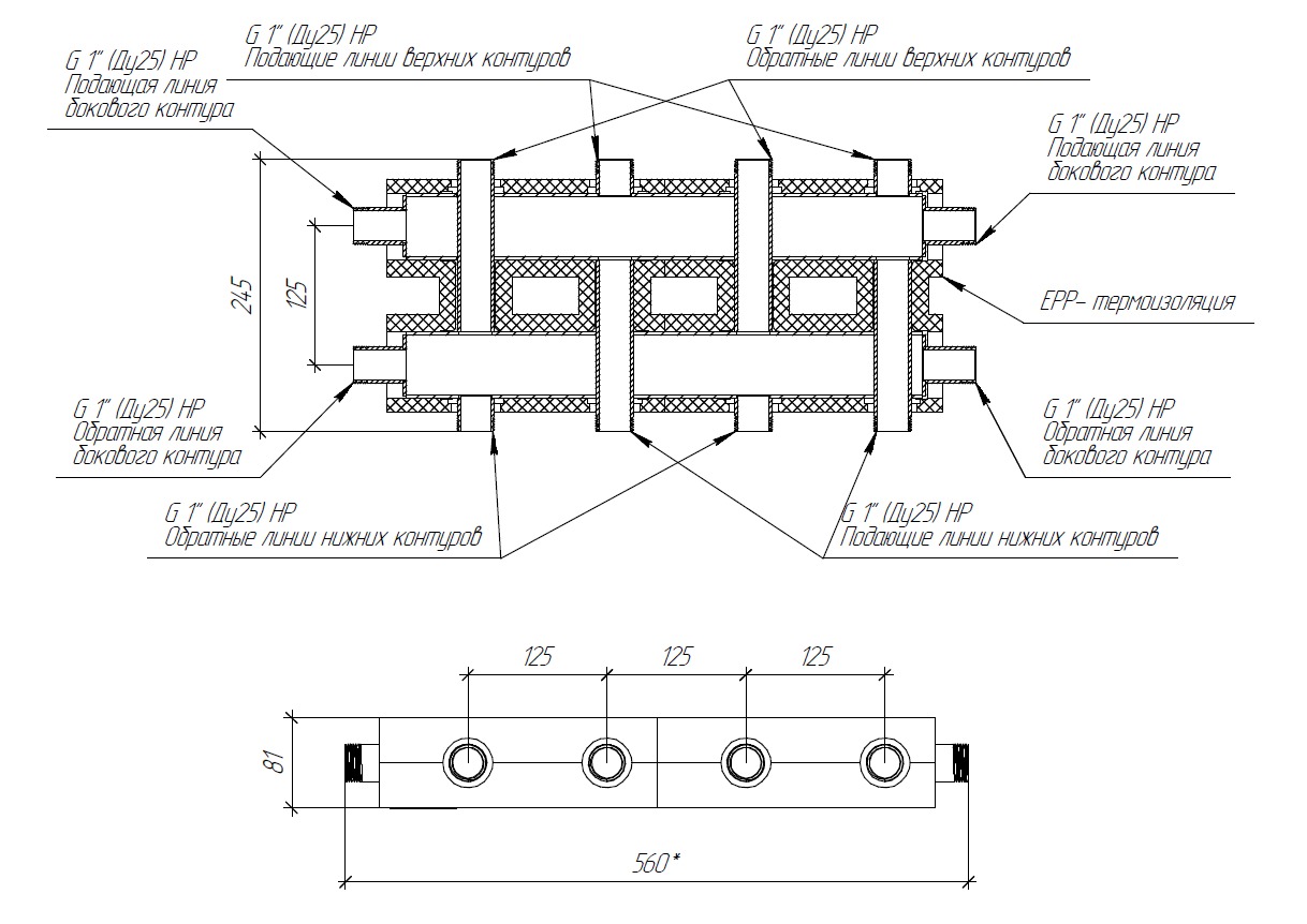 Модульный коллектор MK-60-5DU.EPP с термоизоляцией предназначен для распределения теплоносителя на 5 контуров (2+2+1) или объединения нескольких котлов в единую магистраль DN25.