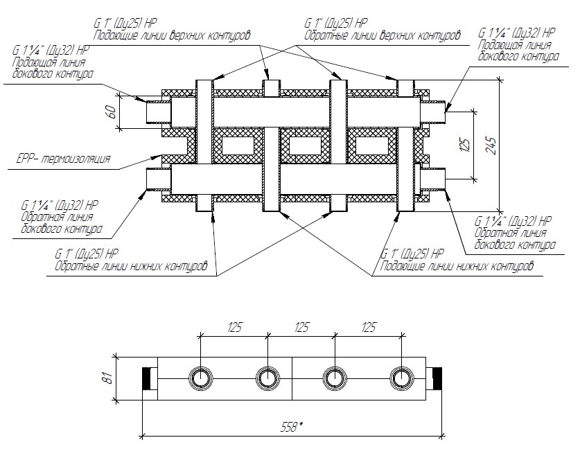 Модульный коллектор отопления нержавеющий с термоизоляцией MKSS-100-4DU.EPP предназначен для распределения и сбора теплоносителя по 4-м контурам-потребителям G 1? (2 вверх и 2 вниз) и одному G ?? (в сторону), где подающая и обратная линия каждого контура расположены в одной плоскости с осевым расстоянием 125 мм.