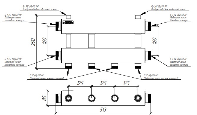 Модульный коллектор MKSS-150-2x25 предназначен для распределения теплоносителя по контурам или его сбора в каскад для вывода на гидравлический разделитель GRSS-150-40.