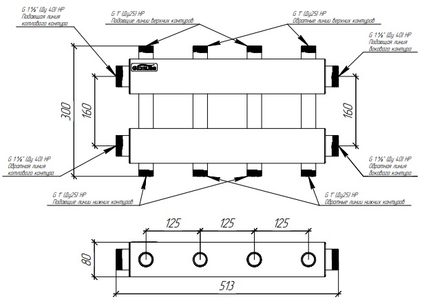 Модульный коллектор MKSS-150-4DUx25 предназначен для распределения теплоносителя по контурам или его сбора в каскад для вывода на гидравлический разделитель GRSS-150-40.