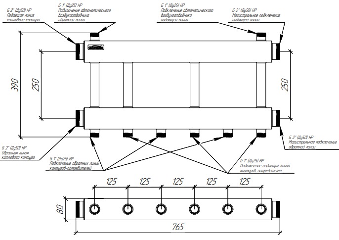 Модульный коллектор MKSS-250-3x25 предназначен для распределения теплоносителя по контурам или его сбора в каскад для вывода на гидравлический разделитель GRSS-250-50.