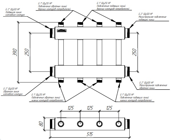 Модульный коллектор MKSS-250-4DU предназначен для распределения теплоносителя по контурам или его сбора в каскад для вывода на гидравлический разделитель GRSS-250-50.