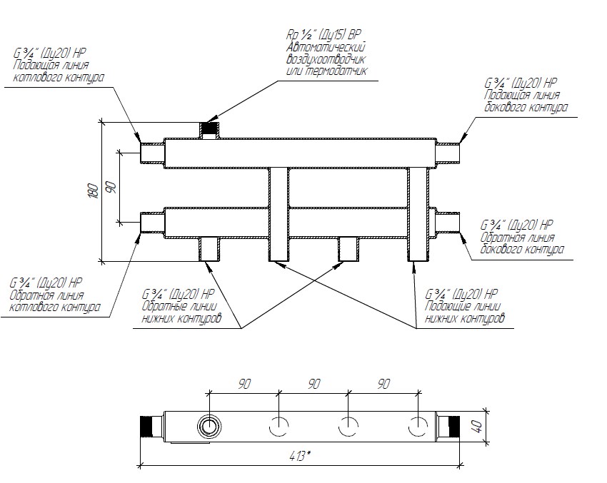 Модульный коллектор отопления MKSS-40-3D с подключениями 3/4 дюйма (DN20) на 3 контура предназначен для обвязки котельных в одноэтажных частных домах до 250 м? с настенным котлом до 40 кВт.