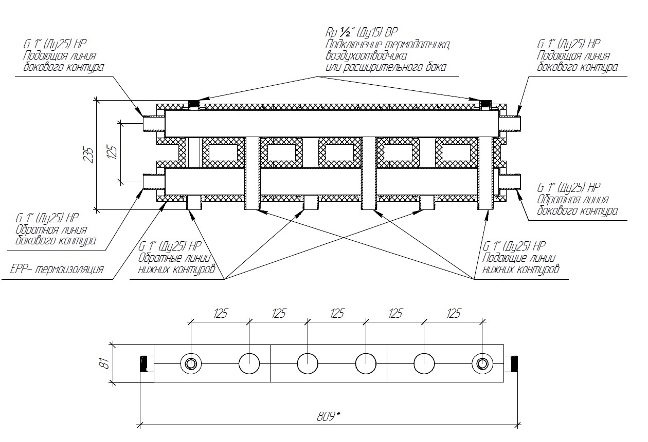 Энергоэффективный нержавеющий модульный коллектор отопления MKSS-60-4D.EPP в современной EPP-термоизоляции предназначен для распределения теплоносителя по контурам или его сбора в каскад для вывода на гидравлический разделитель, где подающая и обратная линия каждого контура расположены в одной плоскости параллельно друг другу на расстоянии 125 мм с осевым расстоянием 125 мм и подводкой 3 сверху или снизу и 1 сбоку.