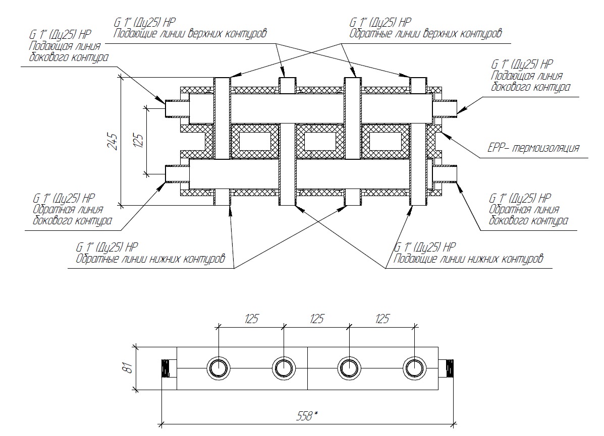 Энергоэффективный нержавеющий модульный коллектор отопления MKSS-60-5DU.EPP в современной EPP-термоизоляции предназначен для распределения теплоносителя по контурам или его сбора в каскад для вывода на гидравлический разделитель, где подающая и обратная линия каждого контура расположены в одной плоскости параллельно друг другу на расстоянии 125 мм с осевым расстоянием 125 мм и подводкой 2 сверху, 2 снизу и 1 сбоку.