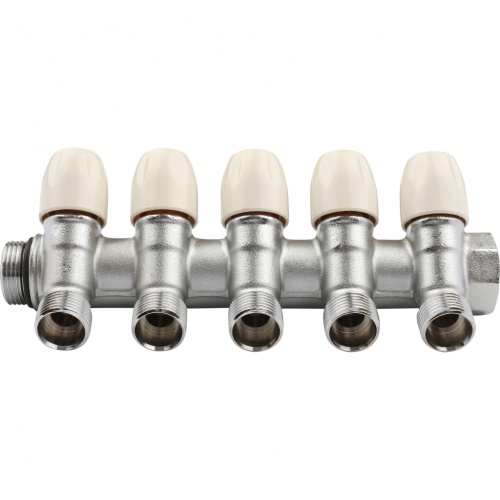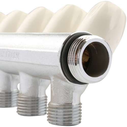 Распределительные коллекторы TIEMME MAXIMA оснащены запорными кранами MAXIMA. Количество выходов варьируется от 2 до 6, материал - хромированная латунь. Резьба с уплотнительным кольцом.