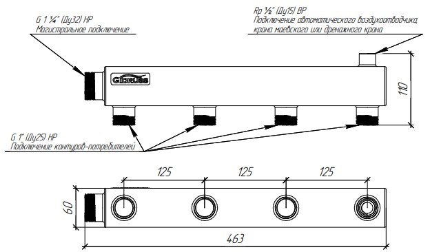 Коллектор распределительный Gidruss DMSS-32-25x4 (магистральное подкл. G 1 1/4", 4 контура G 1", воздухоотвод. Rp 1/2", нерж ст.) (1G 00434 17)