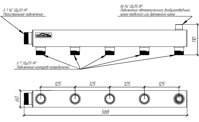 Коллектор распределительный Gidruss DMSS-32-25x5 (магистральное подкл. G 1 1/4", 5 контуров G 1", воздухоотвод. Rp 1/2", нерж ст.) (1G 00435 17)
