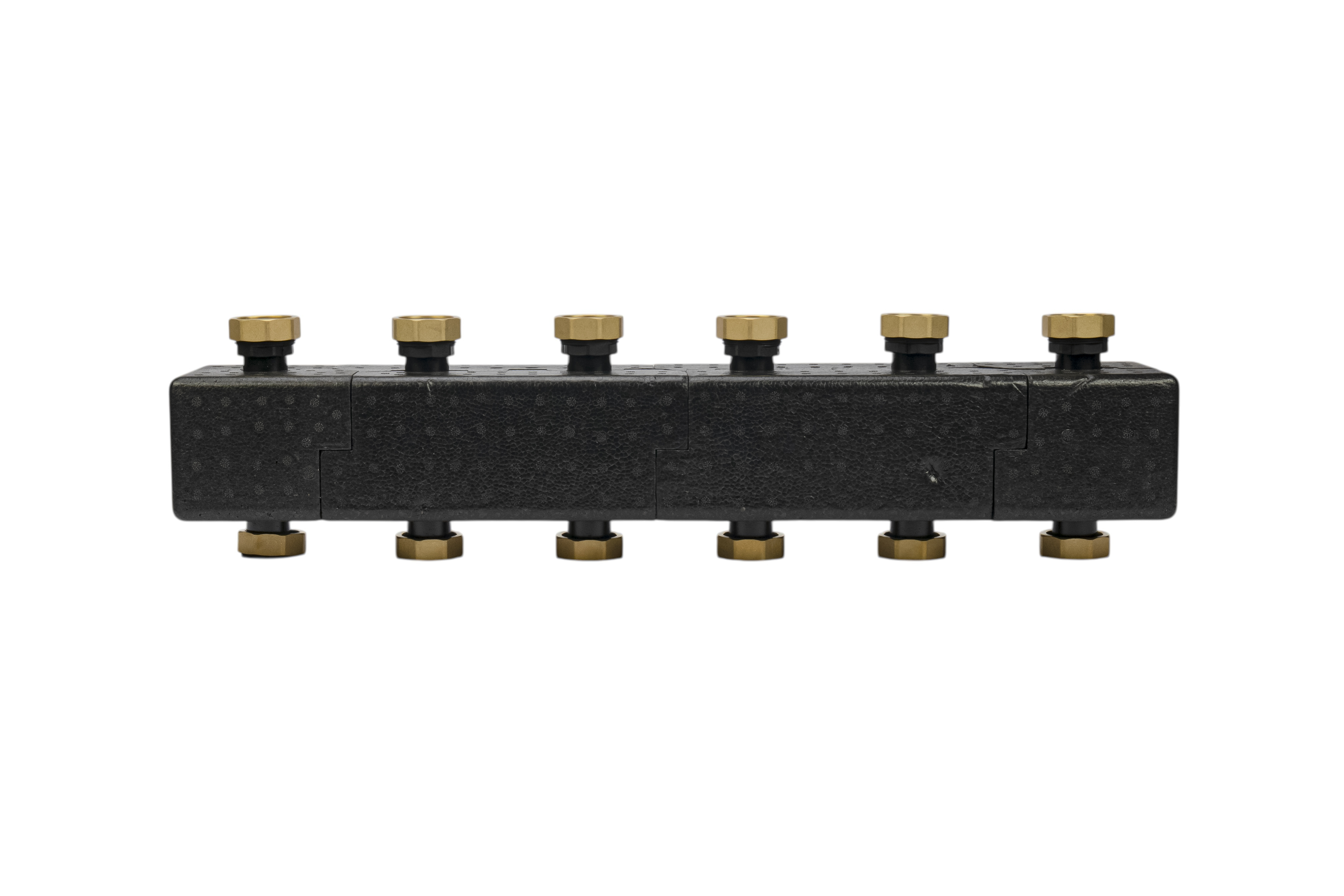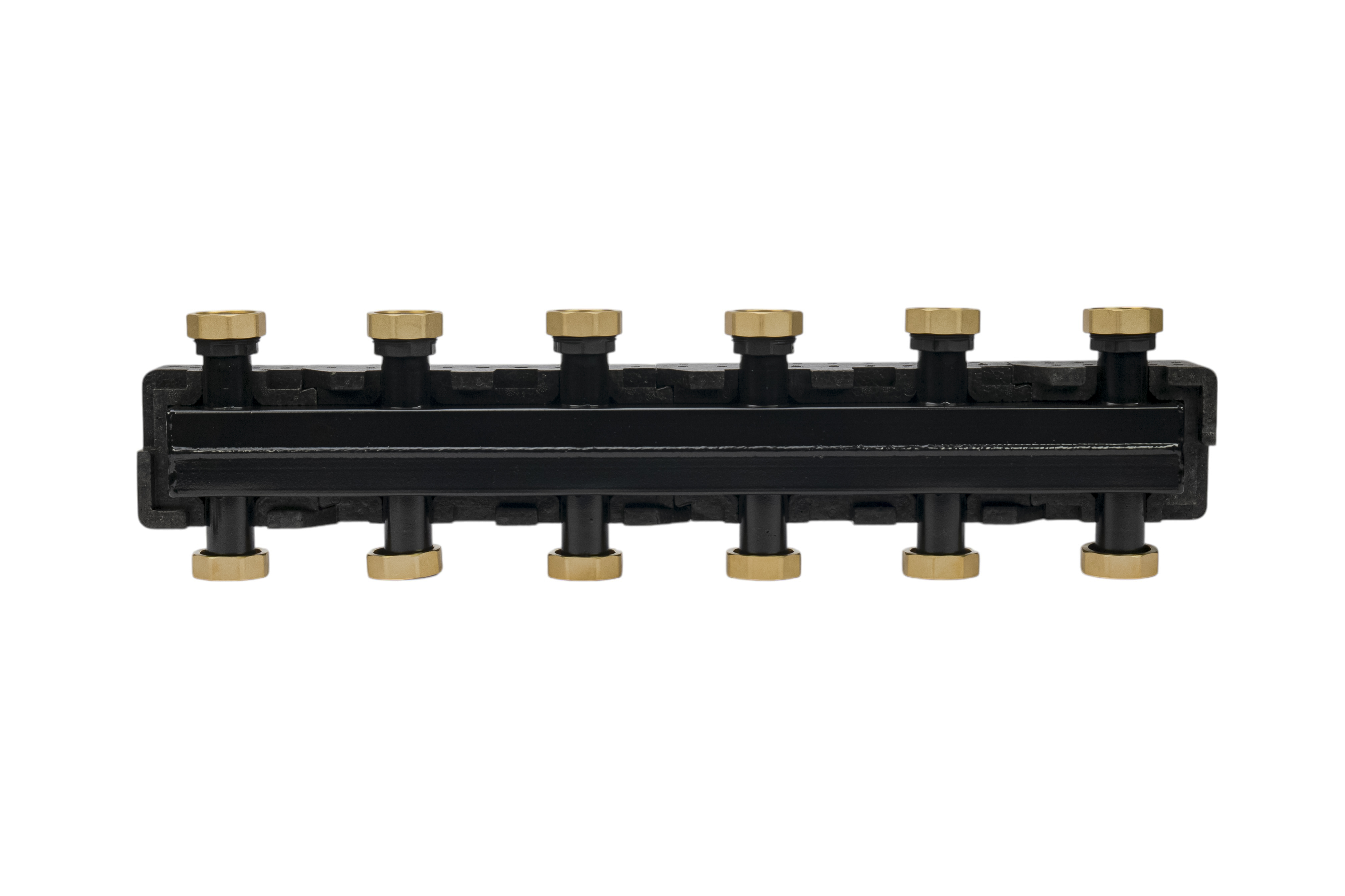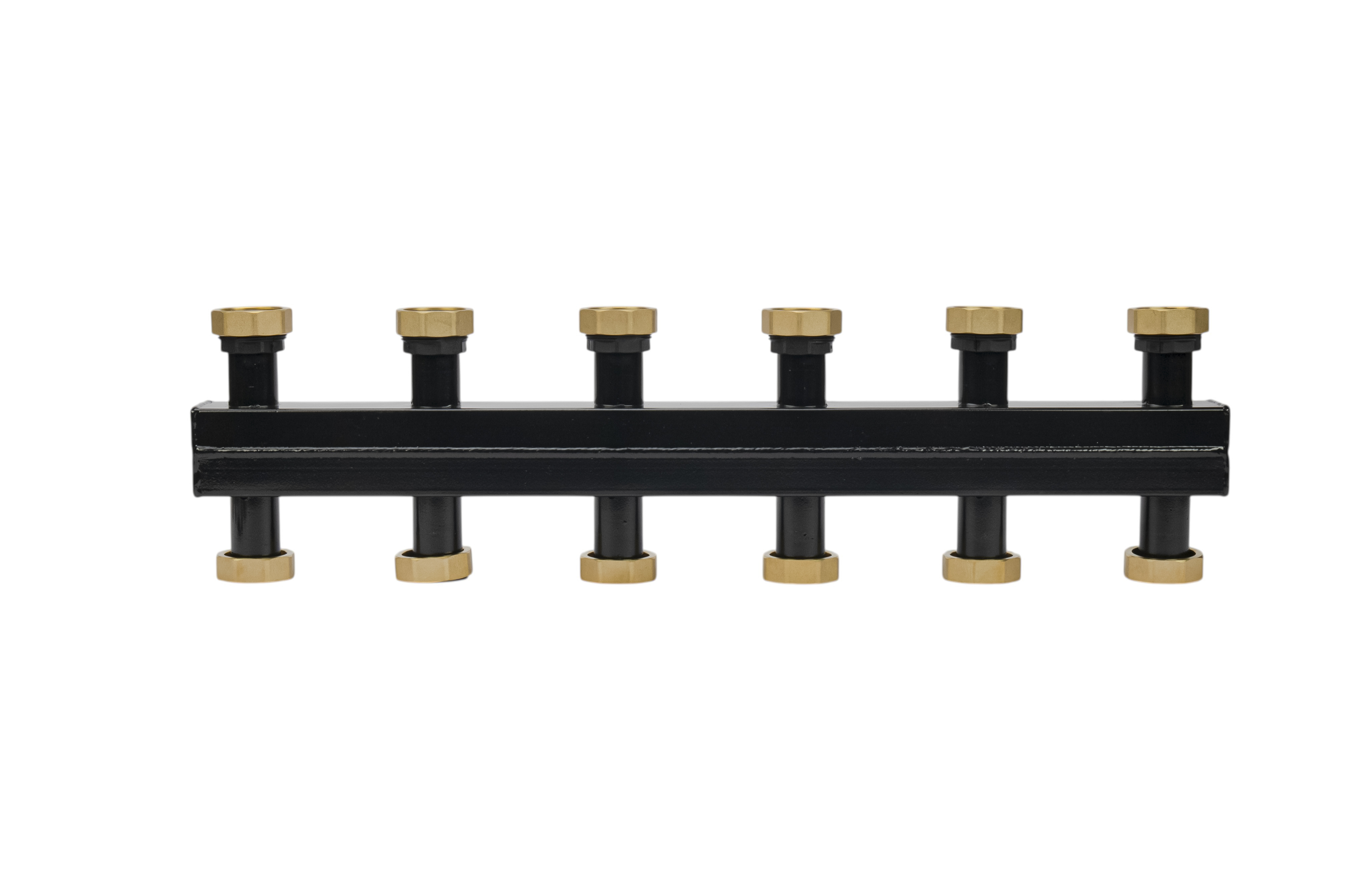 Изделия рассчитаны на номинальный диаметр подключения 25 мм и способны работать при максимальном давлении до 6 бар. Они выдерживают температуру теплоносителя до 110°C и обеспечивают максимальный расход до 3 м3/ч, что соответствует тепловой мощности до 70 кВт при перепаде температуры 20°C. Толщина стенок корпуса — 3 мм, что гарантирует прочность и долговечность коллекторов.