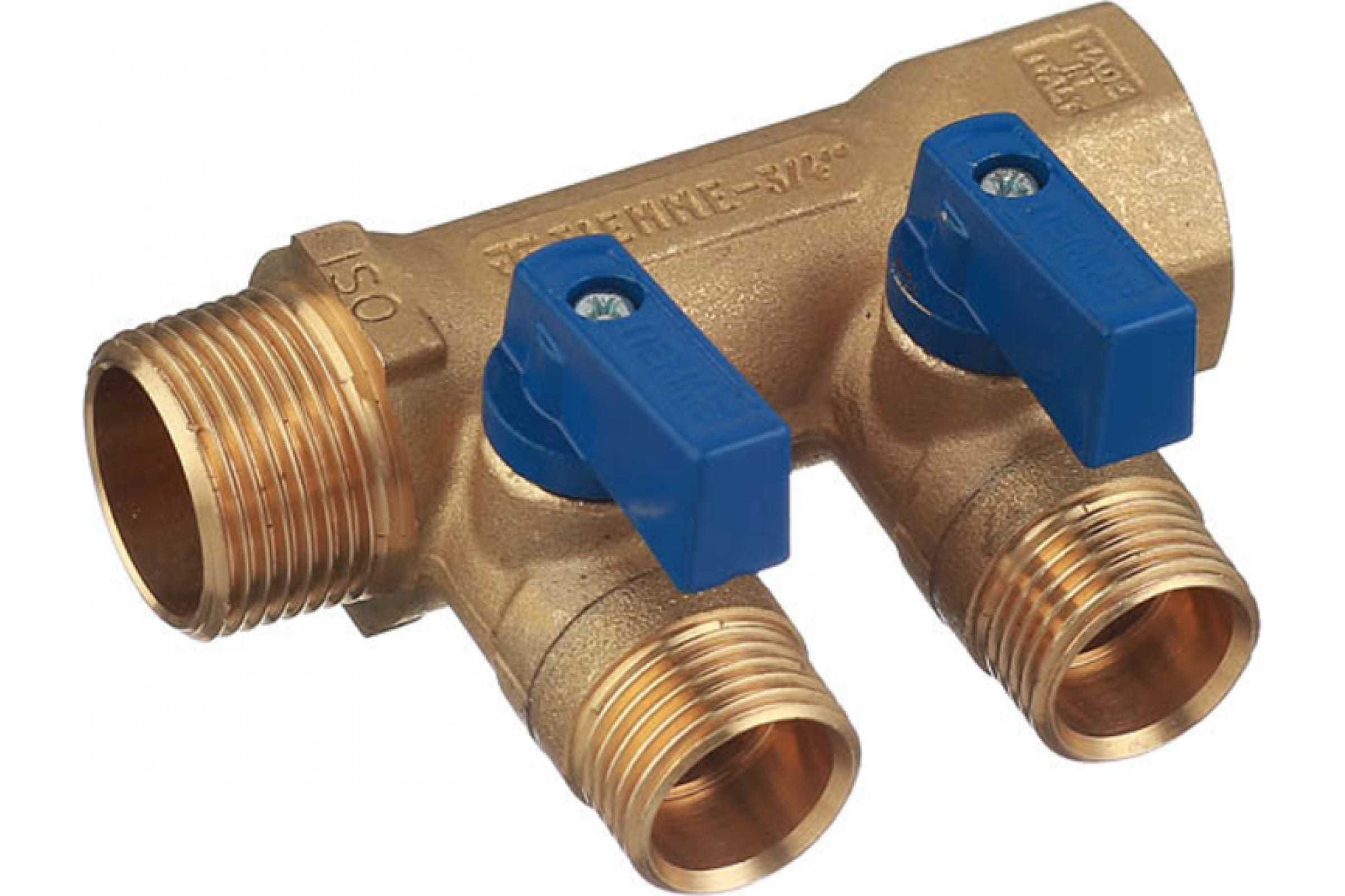 Коллектор с шаровыми клапанами Tiemme 2 отвода 3/4x1/2"(16) (латунь) синие ручки (1820029)