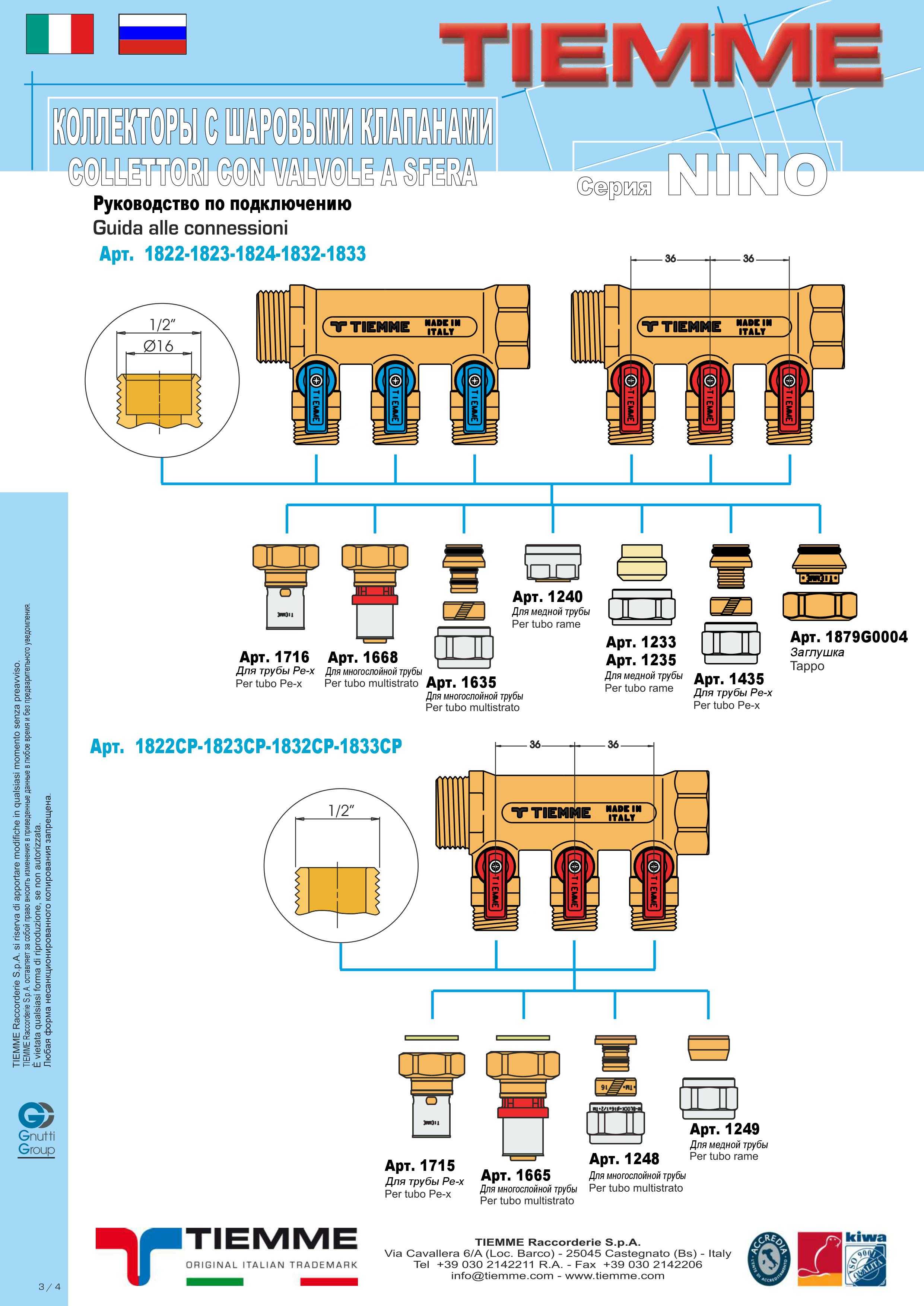 Коллектор с шаровыми кранами Tiemme серии NINO предназначен для равномерного распределения и поступления горячей и/или холодной воды от главного трубопровода по медным, PEX, полипропиленовым или металлопластиковым трубам к сантехнике и другим потребителям без потери напора воды.