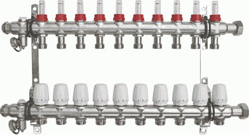 Коллекторная группа 10 отводов 1"*3/4"(18)EK с накидной гайкой и расходомерами TeRma (нерж.ст) (14263)