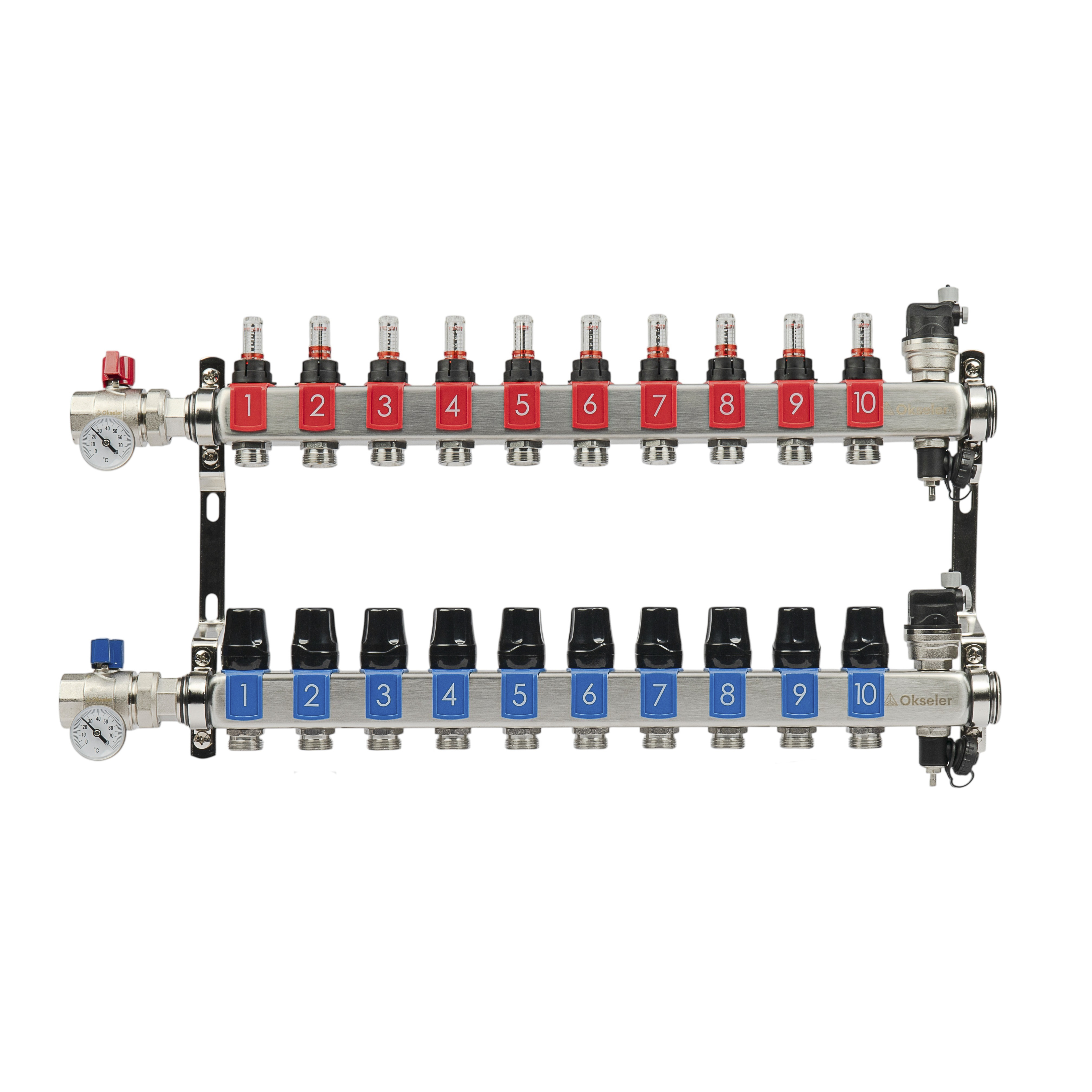 Коллекторный блок OKSELER на 10 выхода с расходомерами и автоматическими воздухоотводчиками предназначен для систем водяного отопления и теплого пола. Обеспечивает точное распределение теплоносителя по двум контурам с контролем расхода и температуры. Изготовлен из нержавеющей стали AISI 304 для долговечной и надежной работы в системах отопления.