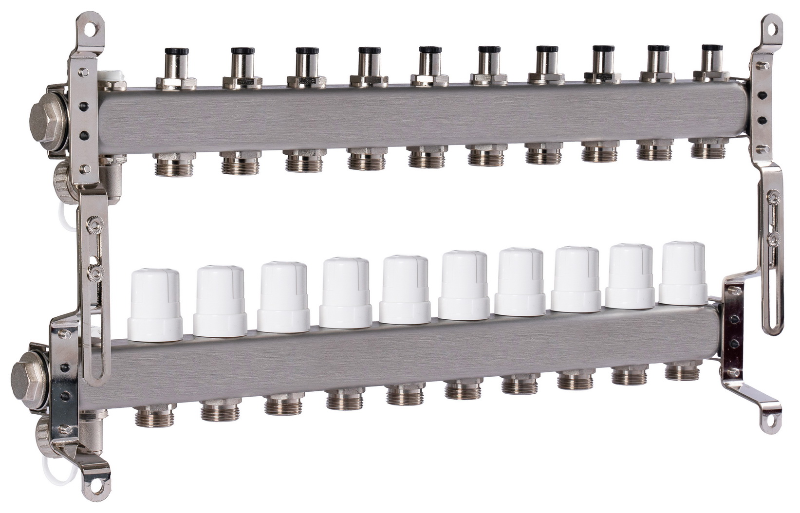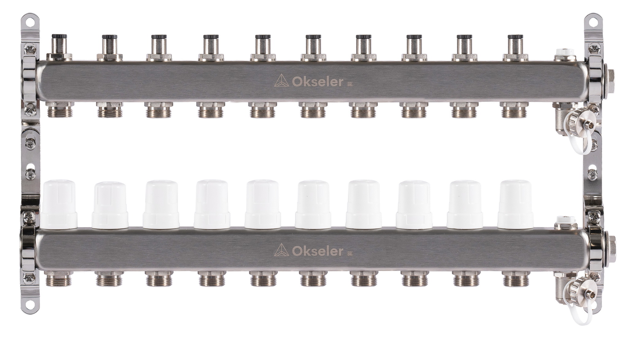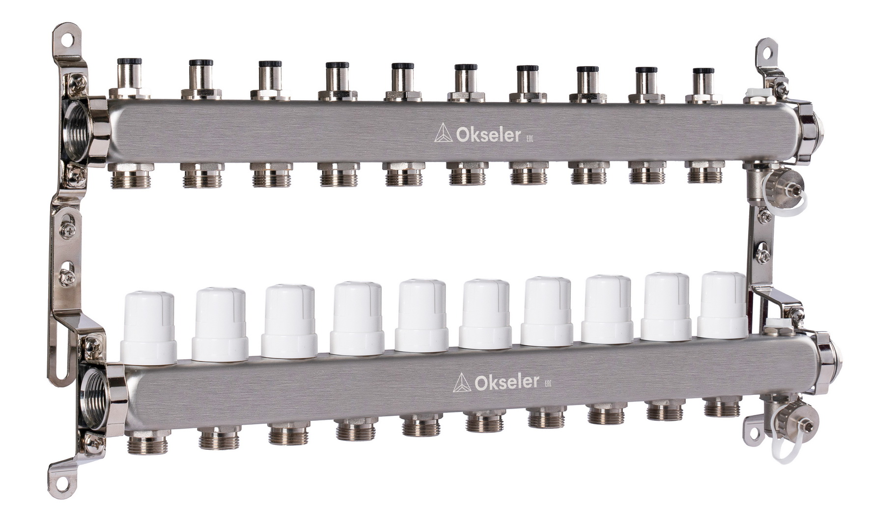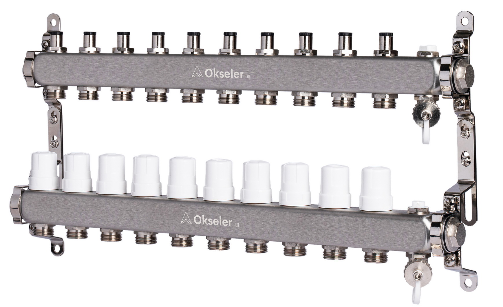 Коллекторный блок Okseler на 10 контуров — распределительный узел из нержавеющей стали для тёплого пола и радиаторных систем. Оснащён кранами регулировки, дренажным краном, краном Маевского. Поддерживает установку сервоприводов. Гарантирует балансировку, надёжность и эффективность отопительной системы.