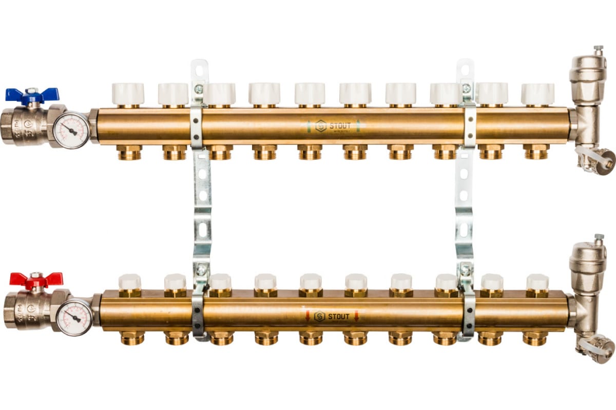Коллекторная группа 10 отводов 1"x3/4"(18)EK в сборе без расходомеров Stout (латунь) (SMB-0468-000010)