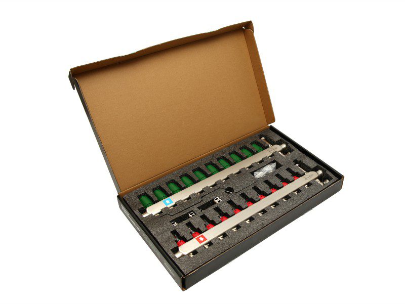Каждая коллекторная группа состоит из подающего и обратного коллекторов из нержавеющей стали SS304 и фитингов из латуни CW617N. Обратные коллектора оборудованы регулирующими клапанами, а подающие - запорными клапанами (серия CS-300-…) или расходомерами (ротаметрами) (серия CS-500(550)-…). Серия CS-550-… каждая подающая и отводящая часть оснащена своим элементом для дренажа и воздухоотводчиком. Условный диаметр коллекторов – 1"". Количество выходов – от 2 до 12.