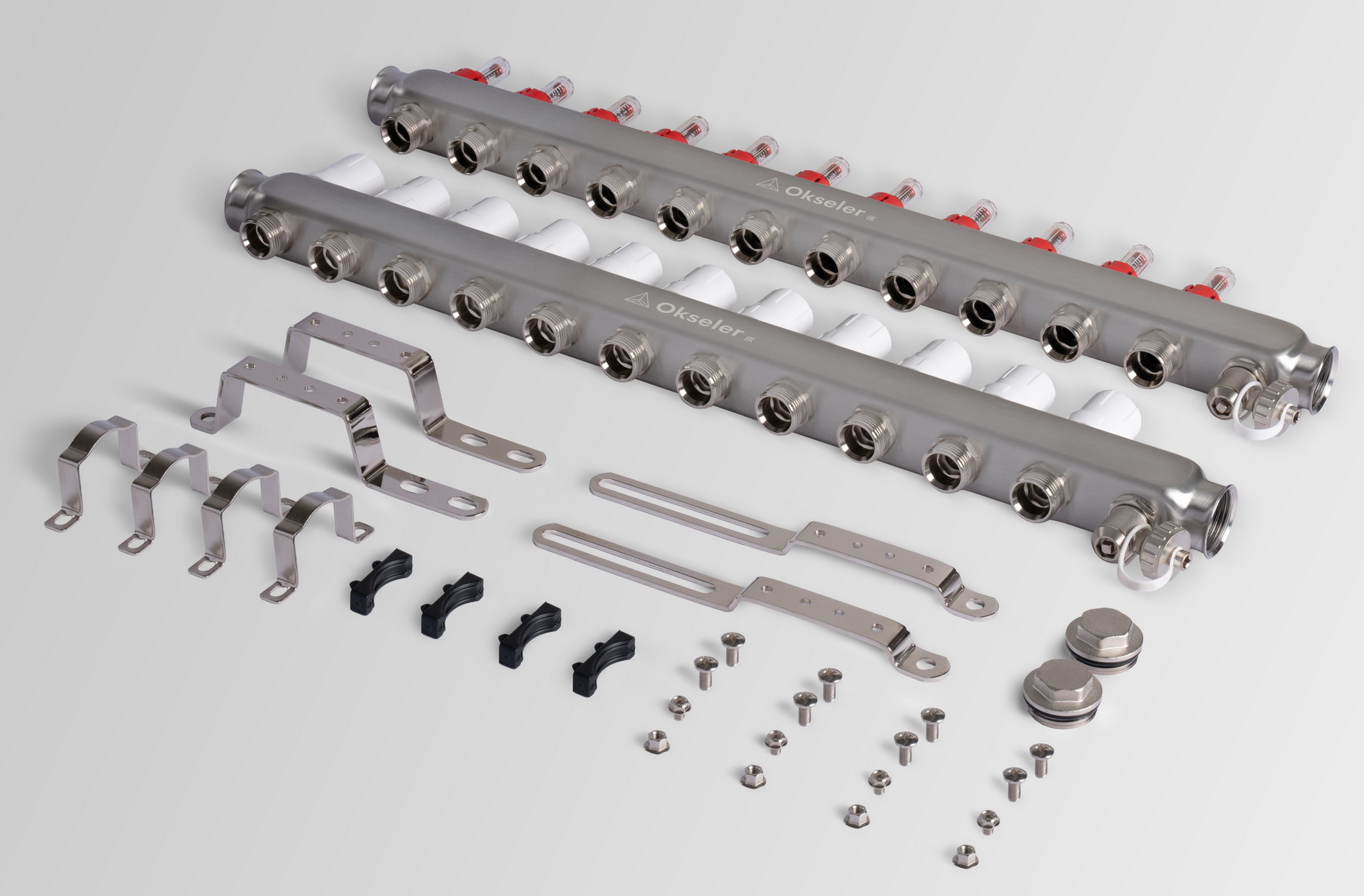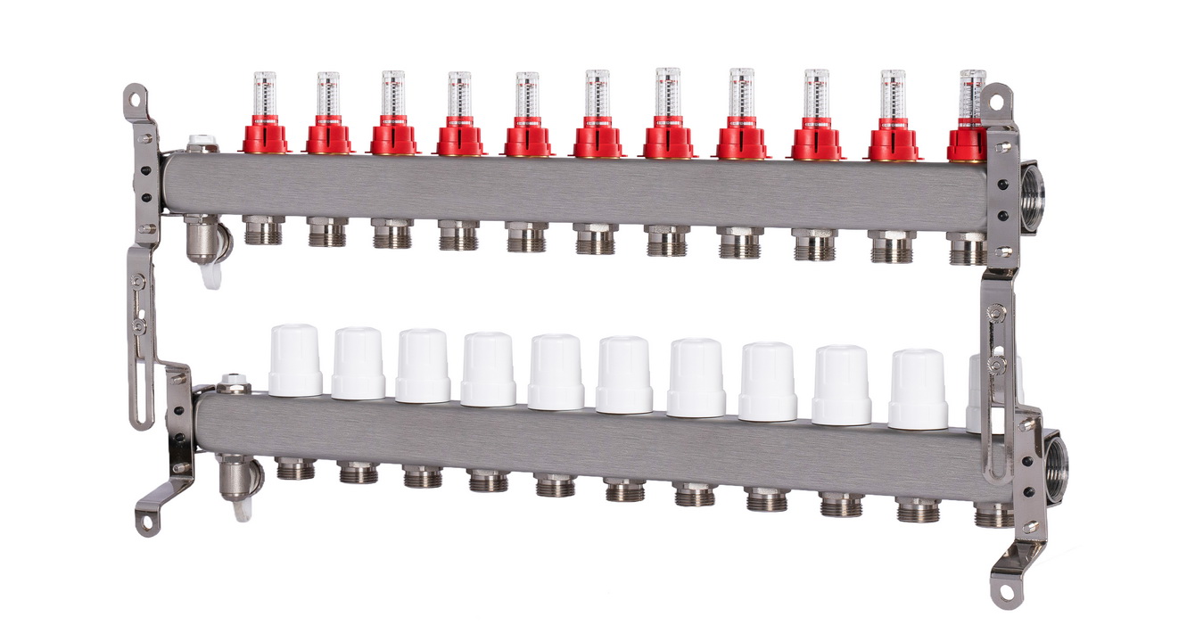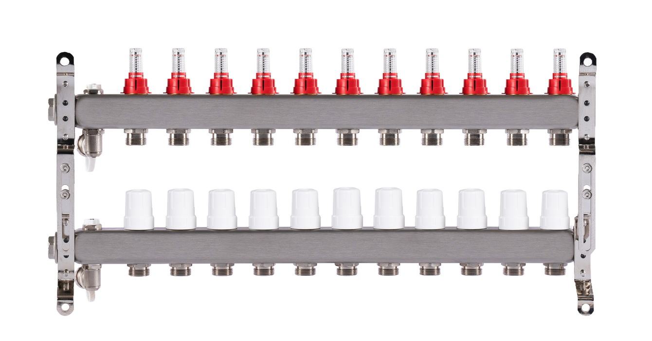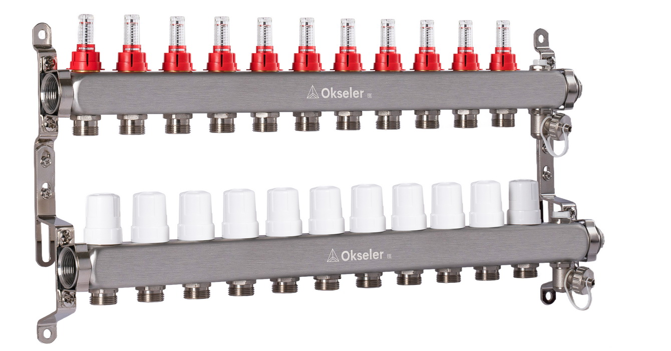 Коллекторный блок Okseler с 11 выходами оборудован расходомерами, дренажным краном и краном Маевского и предназначен для распределения теплоносителя в системах отопления и тёплых водяных полов. Коллектор состоит из подающих и обратных гребёнок, количество выходов которых варьируется от 2 до 12. Подающая гребёнка оснащена расходомерами для точной настройки каждого контура, а обратная — термостатическими клапанами с возможностью установки термоэлектрических сервоприводов.