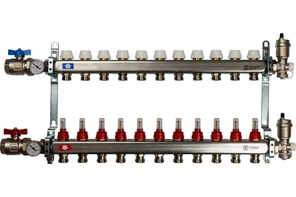 Коллекторная группа STOUT Италия. Коллектор STOUT обладет рядом преимуществ, среди которых надежность конструкции, качественные материалы, оптимальная комплектация блока, варианты исполнения для теплого пола и для радиаторной разводки. Назначение коллекторных блоков- эффективно распределить теплоноситель по отопительным контурам.