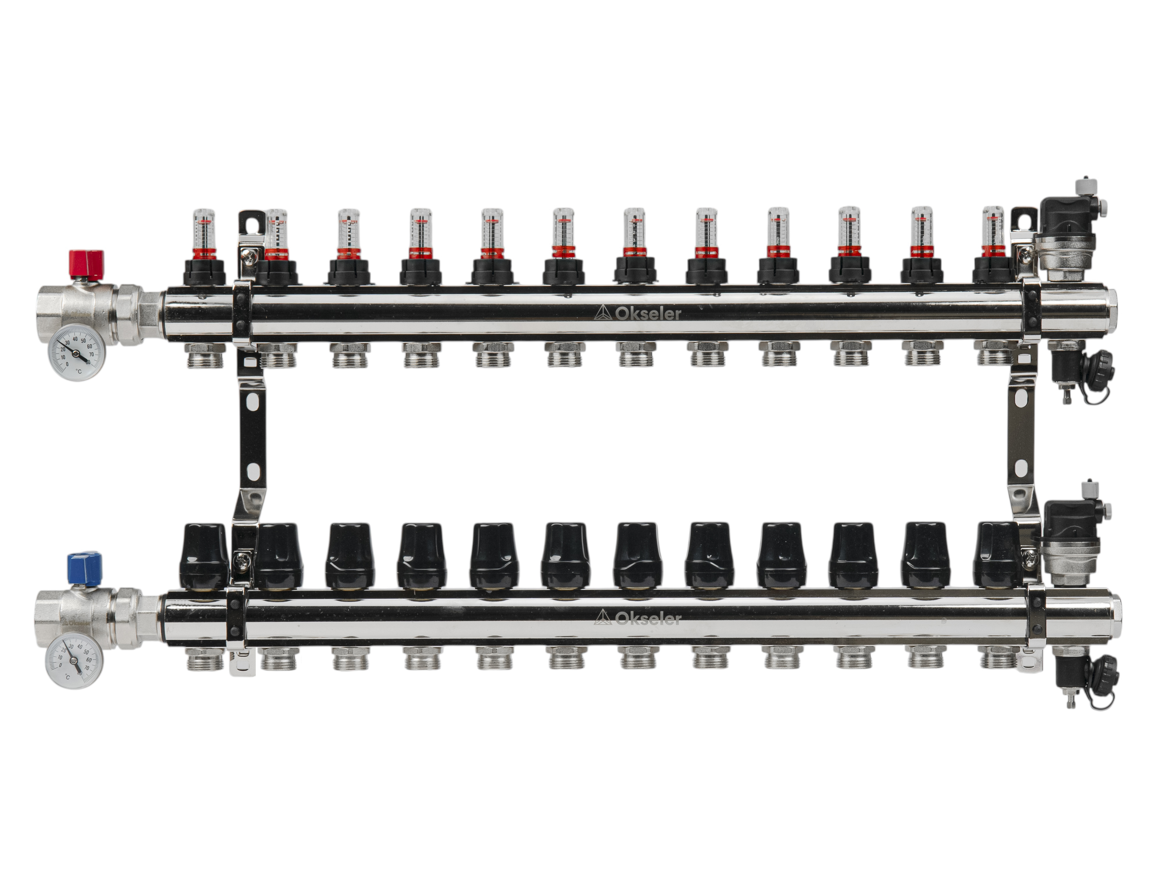 Латунный коллекторный блок OKSELER с 12 выходами — профессиональное решение для систем водяного отопления и теплого водяного пола.