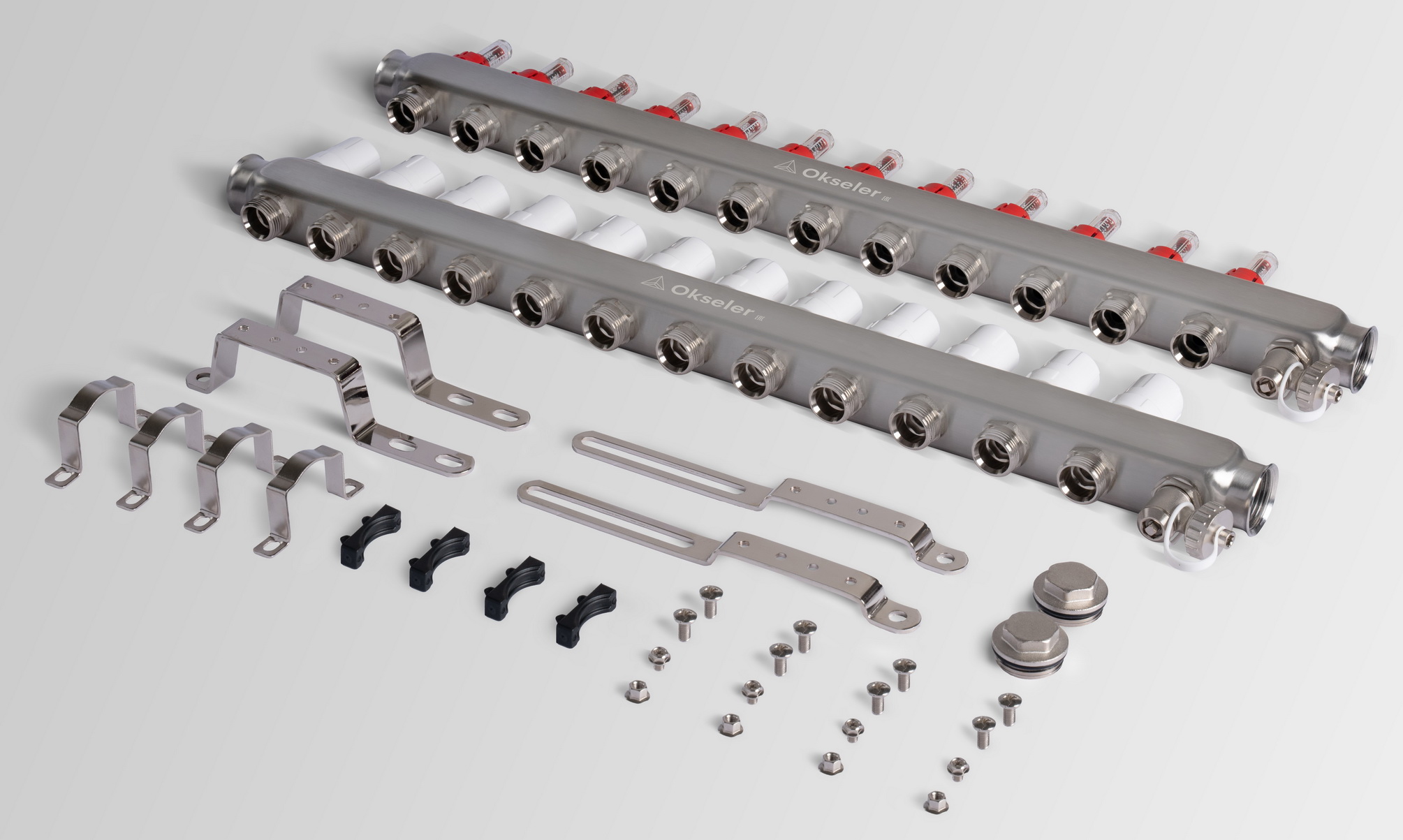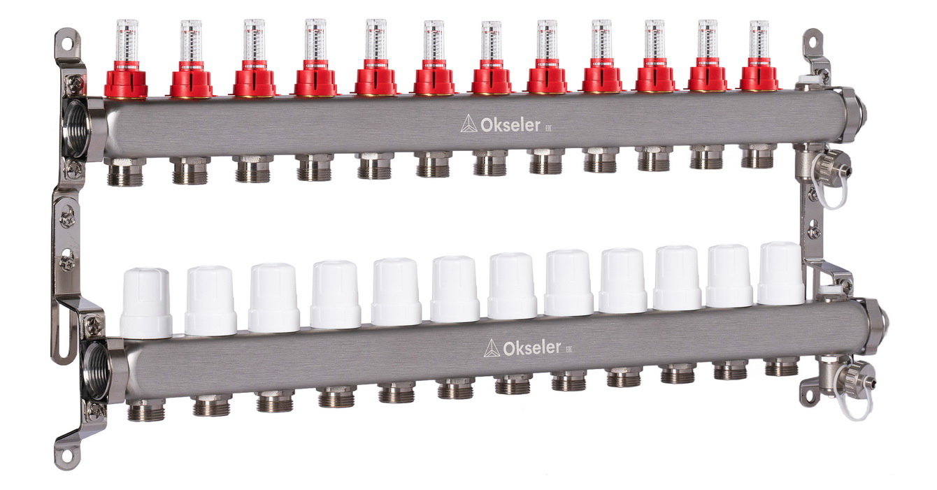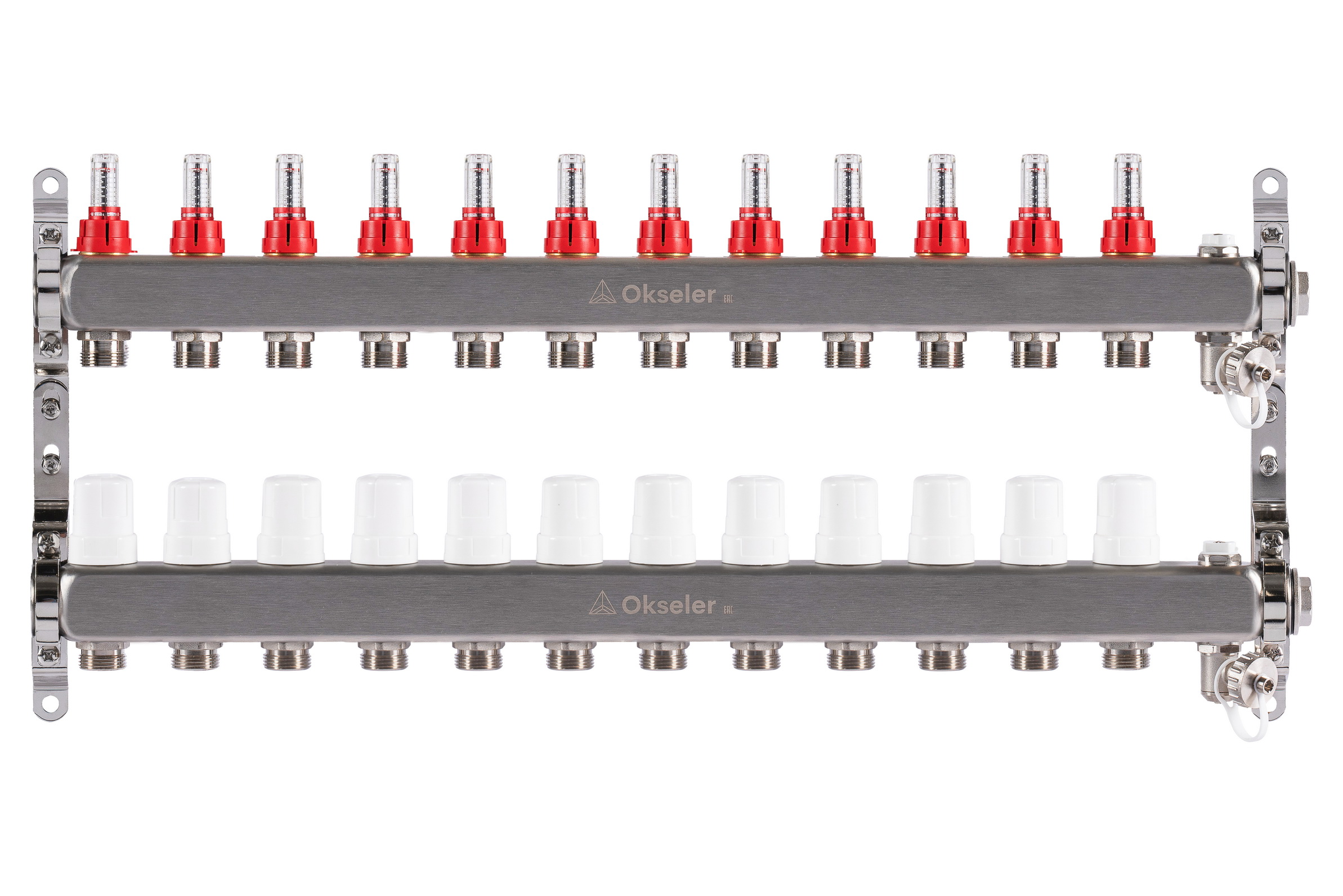 Коллекторный блок Okseler с 11 выходами оборудован расходомерами, дренажным краном и краном Маевского и предназначен для распределения теплоносителя в системах отопления и тёплых водяных полов. Коллектор состоит из подающих и обратных гребёнок, количество выходов которых варьируется от 2 до 12. Подающая гребёнка оснащена расходомерами для точной настройки каждого контура, а обратная — термостатическими клапанами с возможностью установки термоэлектрических сервоприводов.
