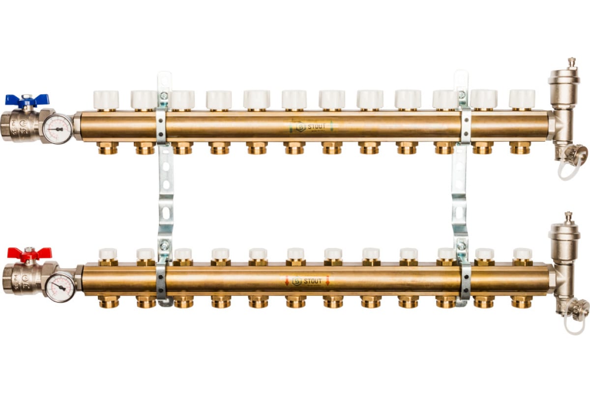 Коллекторная группа 12 отводов 1"x3/4"(18)EK в сборе без расходомеров Stout (латунь) (SMB-0468-000012)