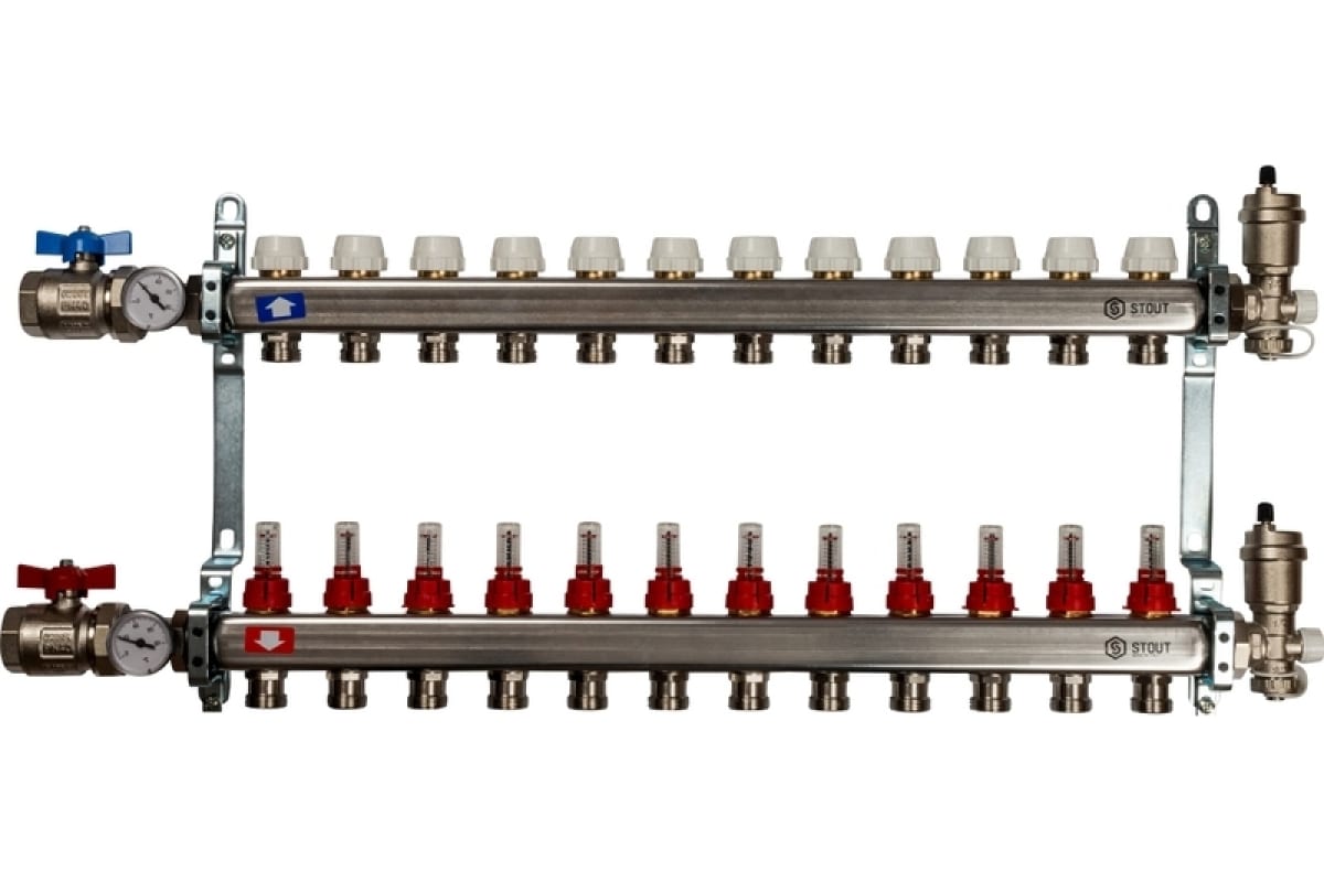 Коллекторная группа 12 отводов 1"x3/4"(18)EK в сборе с расходомерами Stout (нерж.сталь) (SMS-0907-000012)