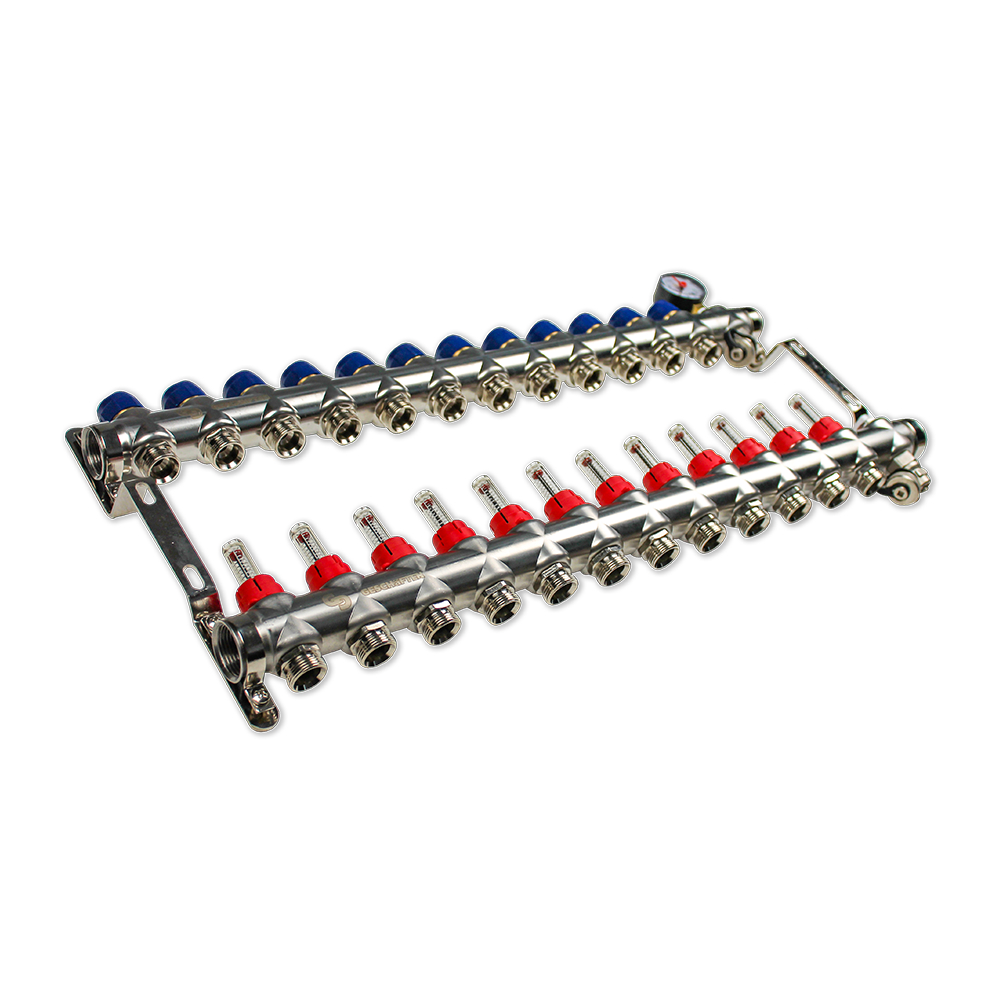 Качественные коллекторы для систем теплого пола и отопления из нержавеющей стали. Предназначены для распределения теплоносителя от источника тепла к отопительными приборами (контурам теплого пола, радиаторам и т.д.). Отличие в том, что на каждом контуре вместо балансировочного клапана установлен расходомер, ещё одно название ротаметр. Расходомер позволяет визуально контролировать скорость потока (л/м) теплоносителя через контур.