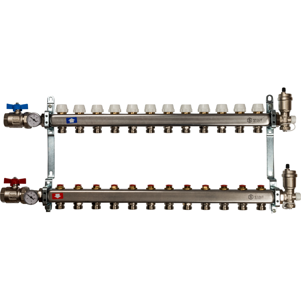 Коллектор из нержавеющей стали в сборе без расходомеров STOUT используется в зданиях с поквартирной разводкой трубопроводов. Изделие может использоваться с трубами из любых материалов. Коллектор служит для подачи и распределения теплоносителя.