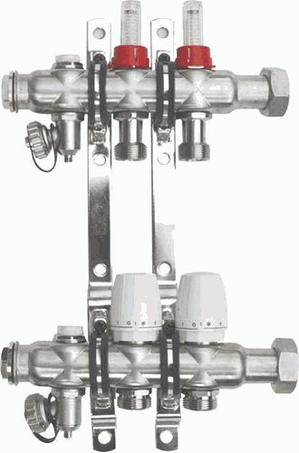 Коллекторный блок нерж.1""с накидной гайкой (расх-ми., регул. и дрен. клапанами, кронш.) 2 вых.14255 TeRma коллекторный блок из нержавеющей стали на 2 выхода служит для распределения потоков по контурам теплого пола, радиаторного отопления, прочих климатических систем, где в качестве теплоносителя используется вода либо незамерзающие растворы. Выходы обратного коллектора блока оборудованы термостатическими, подающего – настроечными клапанами. Коллекторы оснащены воздухоотводчиками с отсекающими клапанами, дренажными кранами, самоуплотняющимися пробками. Стандарт присоединения трубных петель – «евроконус» на 3/4"". В комплект входят крепежные кронштейны, коллекторный блок имеет диаметр подключения 1 дюйм с внутренней резьбой.