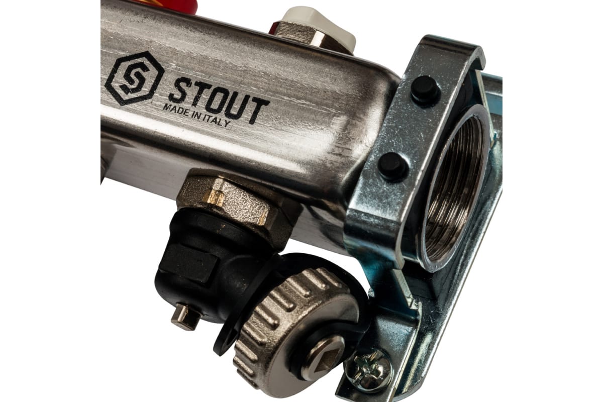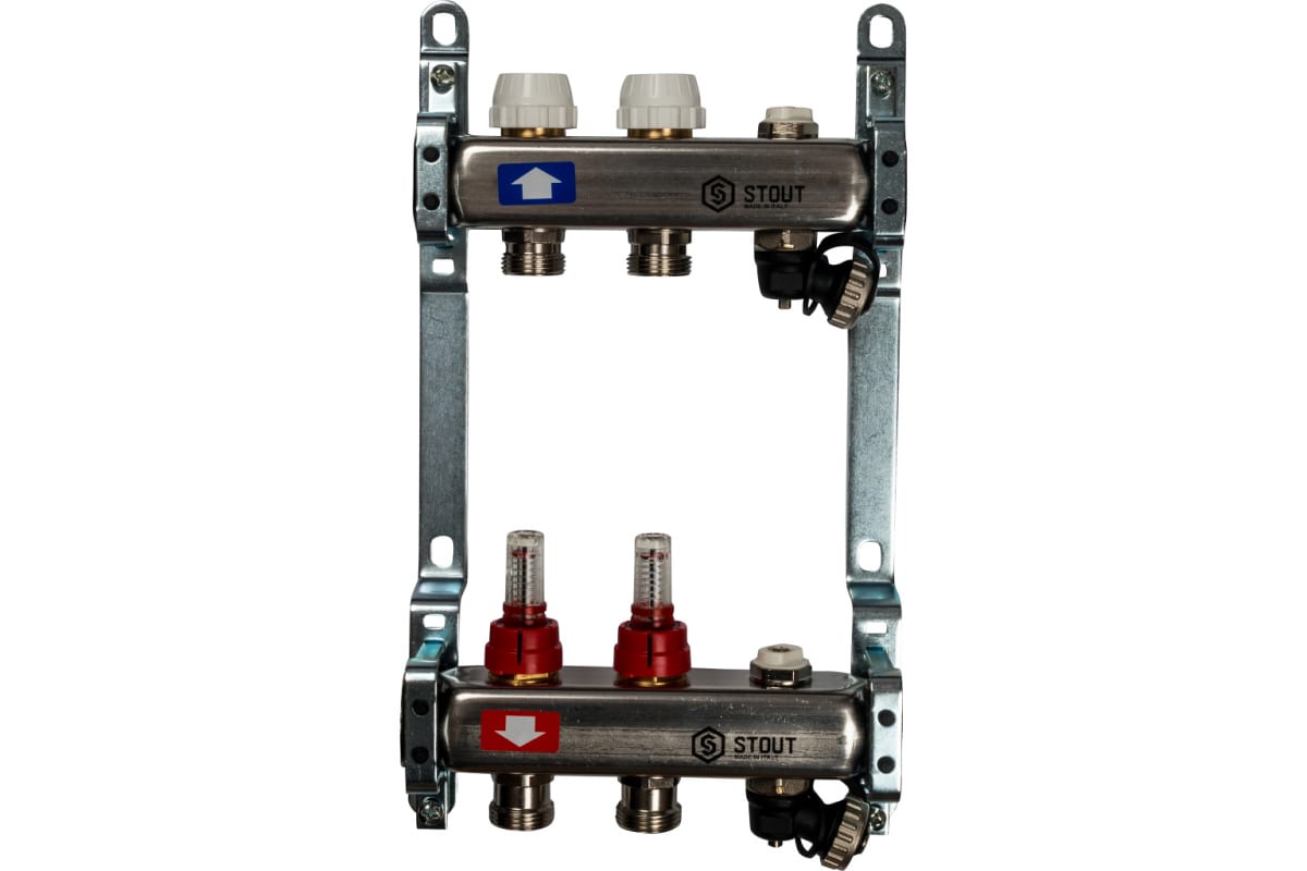 Коллекторная группа 2 отвода 1"x3/4"(18)EK с расходомерами, с клапаном вып. воздуха и сливом Stout (нерж.сталь) (SMS-0927-000002)