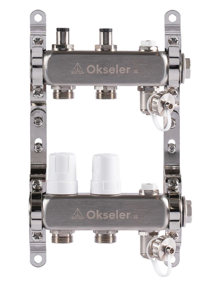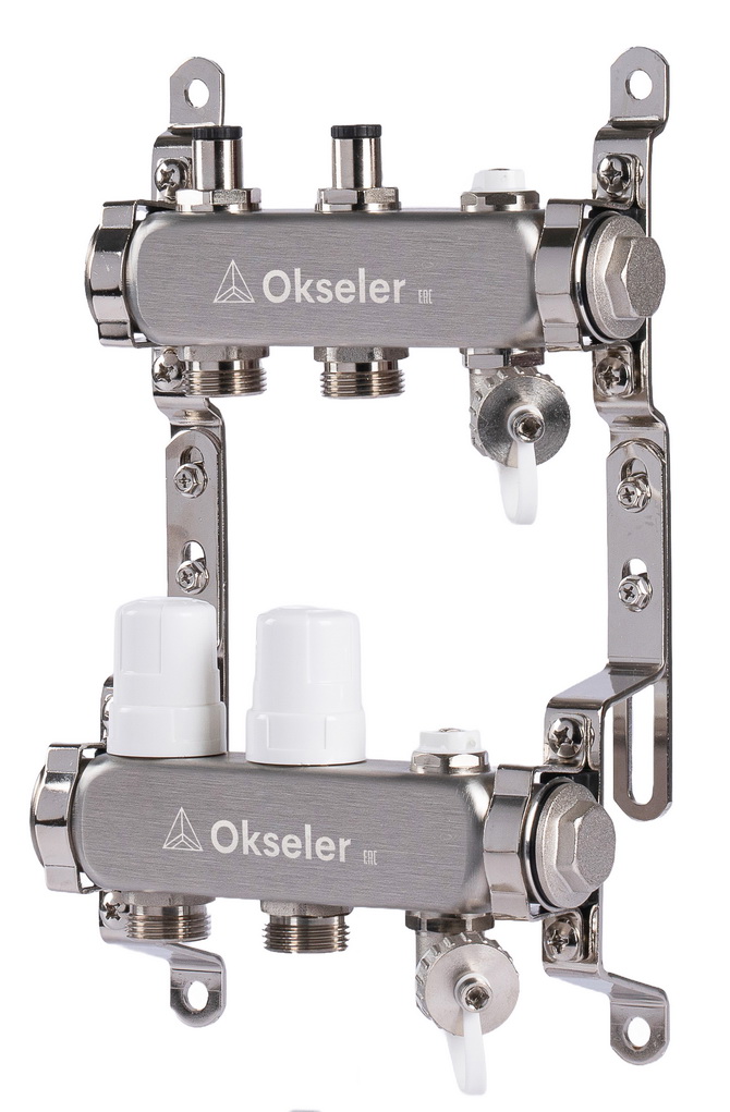 Коллекторный блок Okseler на 2 выхода с регулировочными клапанами предназначен для распределения теплоносителя в системах отопления и теплого водяного пола. Конструкция блока включает подающую и обратную гребенки, каждая из которых оборудована клапанами для точной настройки и управления каждым контуром. Подающая гребенка оснащена балансировочными клапанами, обеспечивающими регулировку расхода, а обратная — термостатическими клапанами с возможностью установки термоэлектрических сервоприводов.