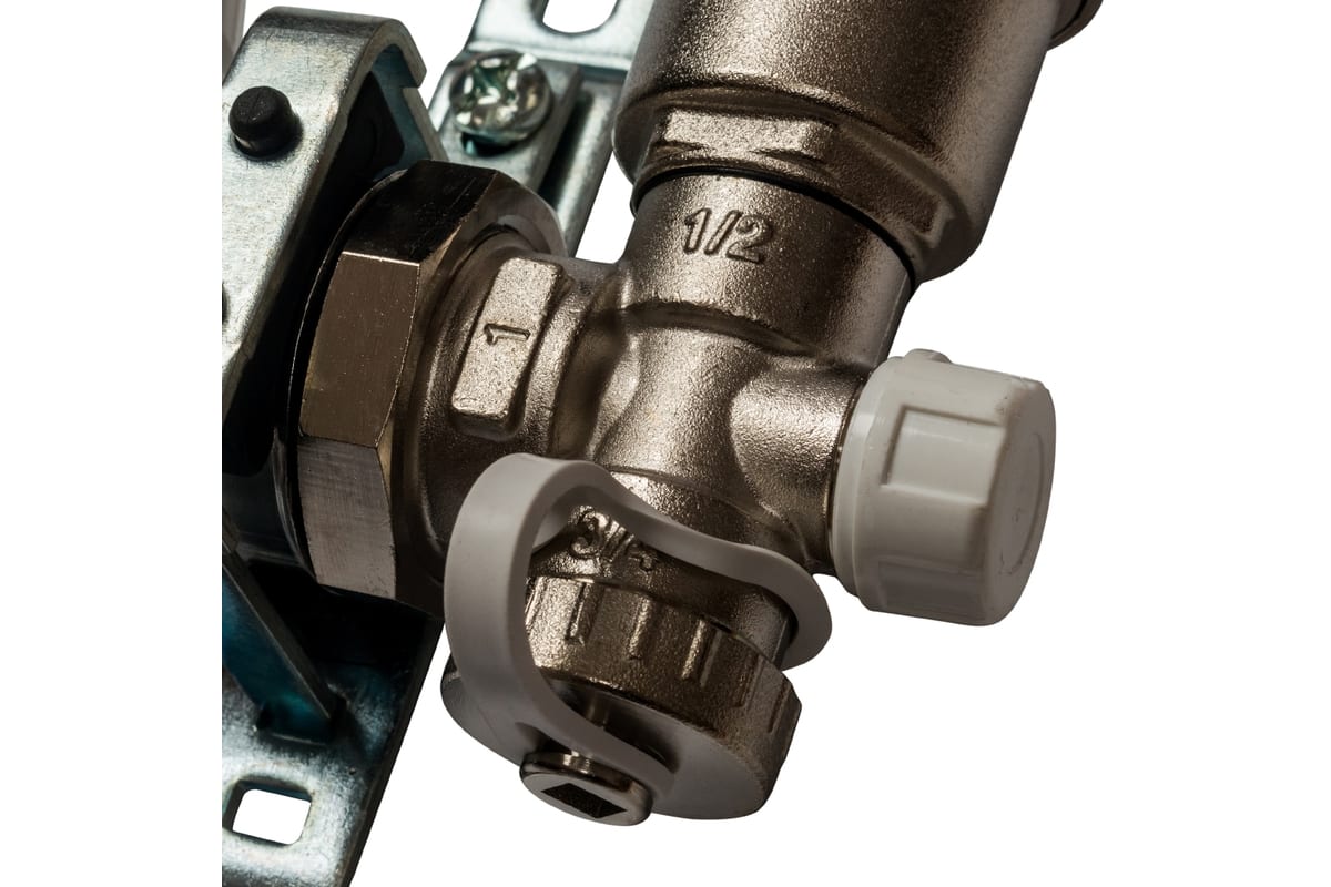 Комплектация: Шаровой кран с разъёмным соединением - 2, вставка со стрелочным термометром - 2, кронштейн - 2, коллектор подающий, штуцер под компрессионный фитинг типа «Евроконус» - 2, коллектор обратный, клапан терморегулятора с регулирующим колпачком - 2, балансировочный расходомер - 2, автоматический воздухоотводчик - 2, спускной кран с крышкой-ключом - 2