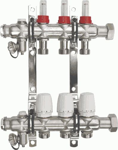 Коллекторный блок нерж.1""с накидной гайкой (расх-ми., регул. и дрен. клапанами, кронш.) 3 вых.14256 TeRma коллекторный блок из нержавеющей стали на 3 выхода служит для распределения потоков по контурам теплого пола, радиаторного отопления, прочих климатических систем, где в качестве теплоносителя используется вода либо незамерзающие растворы. Выходы обратного коллектора блока оборудованы термостатическими, подающего – настроечными клапанами. Коллекторы оснащены воздухоотводчиками с отсекающими клапанами, дренажными кранами, самоуплотняющимися пробками. Стандарт присоединения трубных петель – «евроконус» на 3/4"". В комплект входят крепежные кронштейны, коллекторный блок имеет диаметр подключения 1 дюйм с внутренней резьбой.