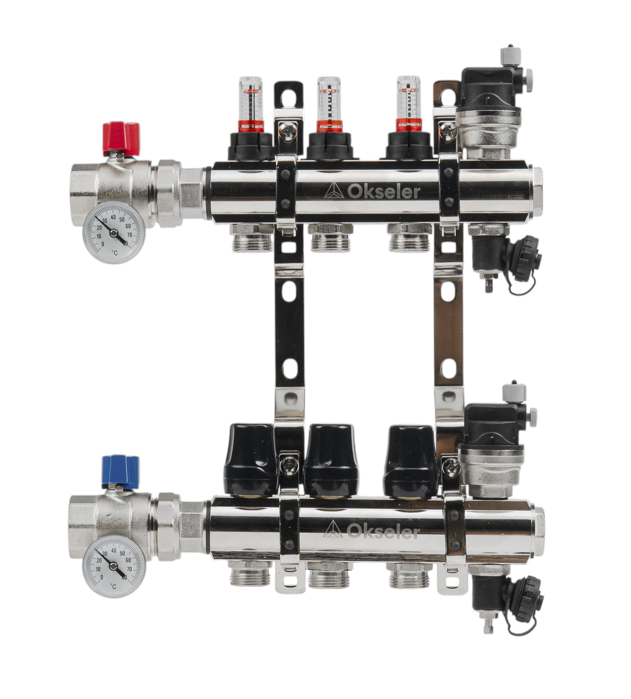 Коллекторная группа 3 отвода 1"*3/4"(18) ЕК с расходомерами Okseler (латунь) с автоматическими воздухоотводчикоми и шаровыми кранами с термометрами (O