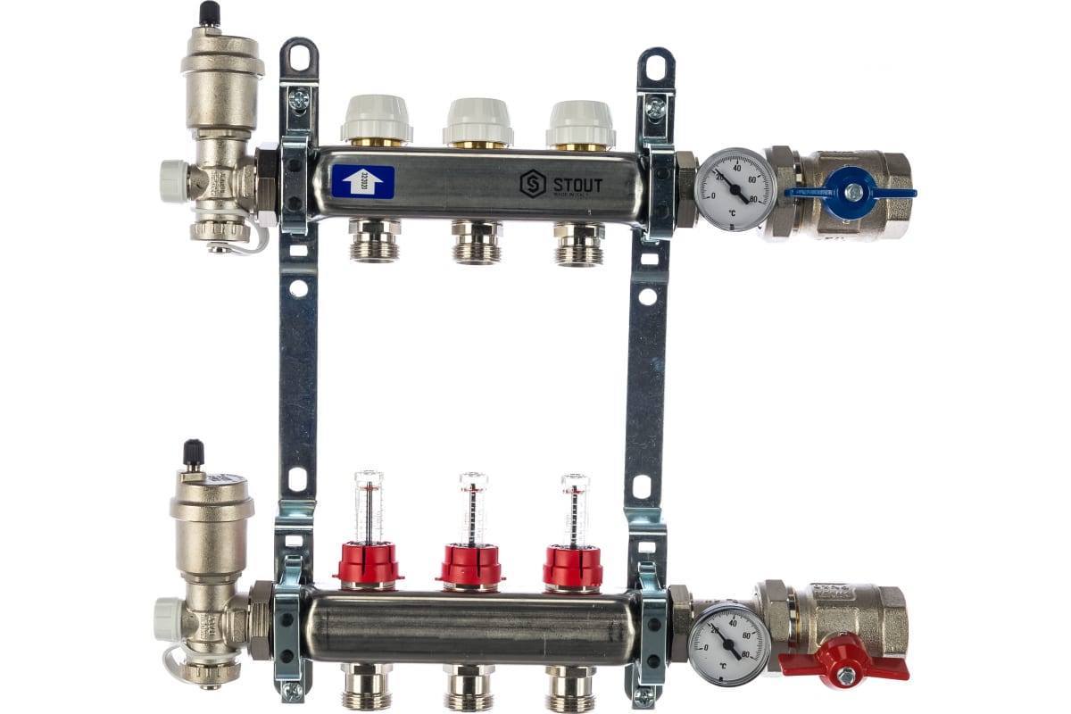 Коллекторная группа 3 отвода 1"x3/4"(18)EK в сборе с расходомерами Stout (нерж.сталь) (SMS-0907-000003)
