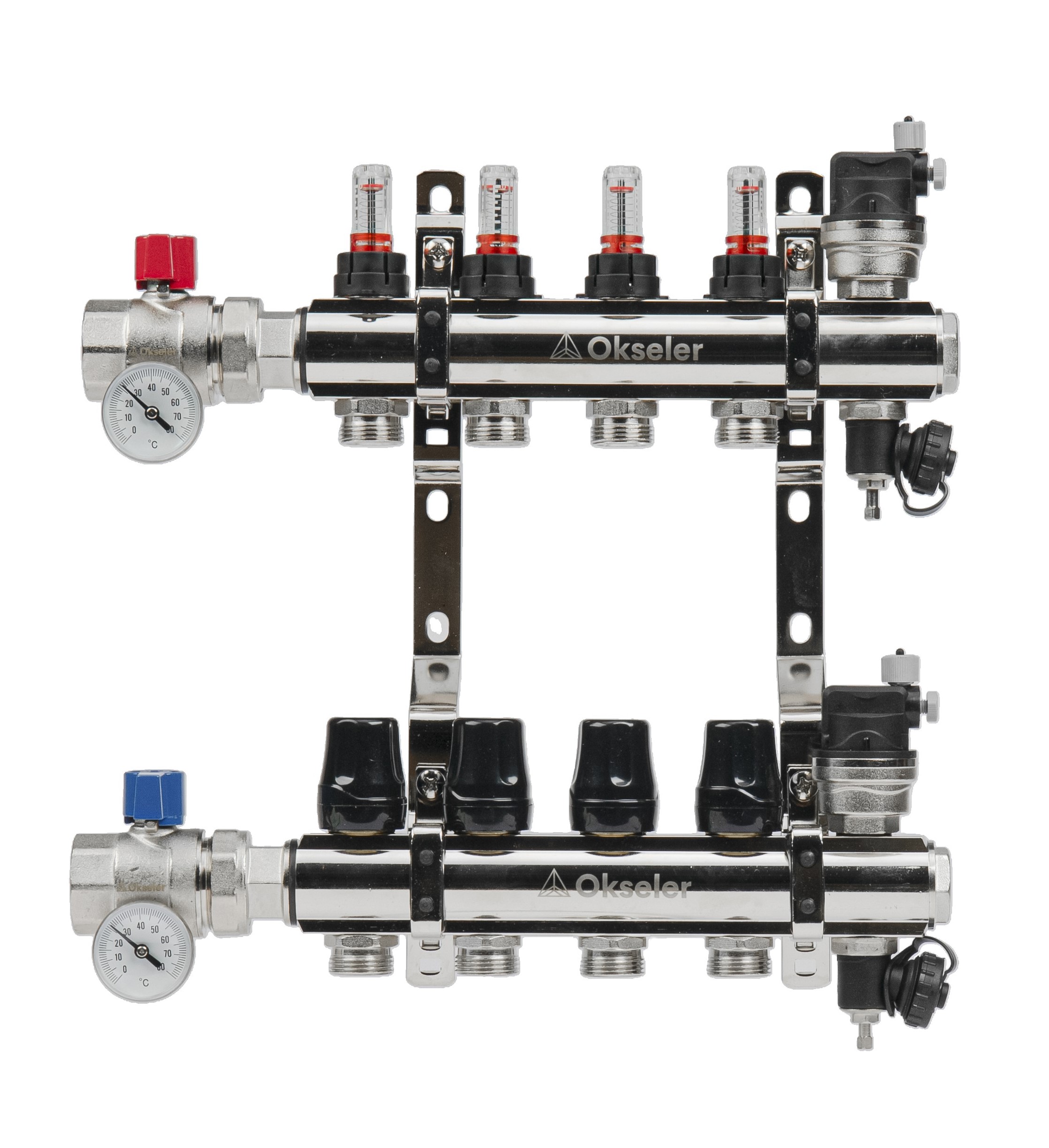Латунный коллекторный блок OKSELER с 4 выходами — профессиональное решение для систем водяного отопления и теплого водяного пола.