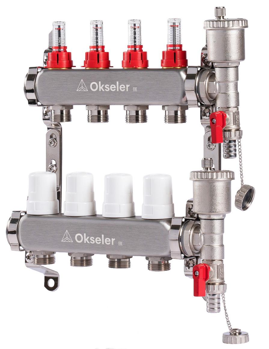Коллекторный блок Okseler с 4 выходами — это распределительный коллектор, разработанный для систем отопления и теплых водяных полов. Конструкция включает подающую и обратную гребенки, каждая из которых оснащена четырьмя выходами. Подающая гребенка оборудована расходомерами для точного регулирования каждого контура, а обратная — термостатическими клапанами с возможностью установки термоэлектрических сервоприводов.