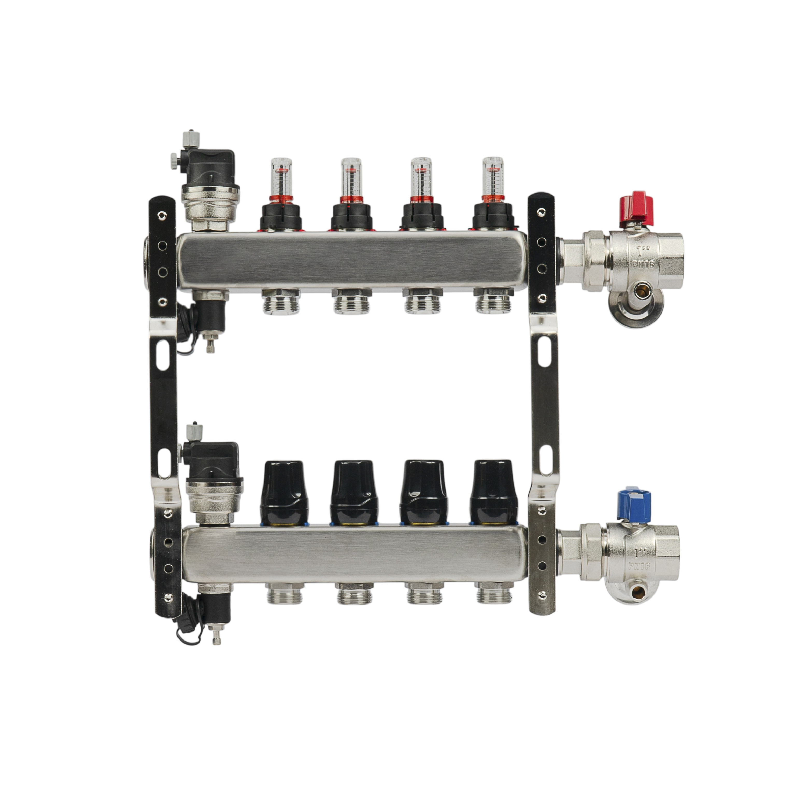 Коллекторный блок OKSELER на 4 выхода с расходомерами и автоматическими воздухоотводчиками предназначен для систем водяного отопления и теплого пола. Обеспечивает точное распределение теплоносителя по двум контурам с контролем расхода и температуры. Изготовлен из нержавеющей стали AISI 304 для долговечной и надежной работы в системах отопления.