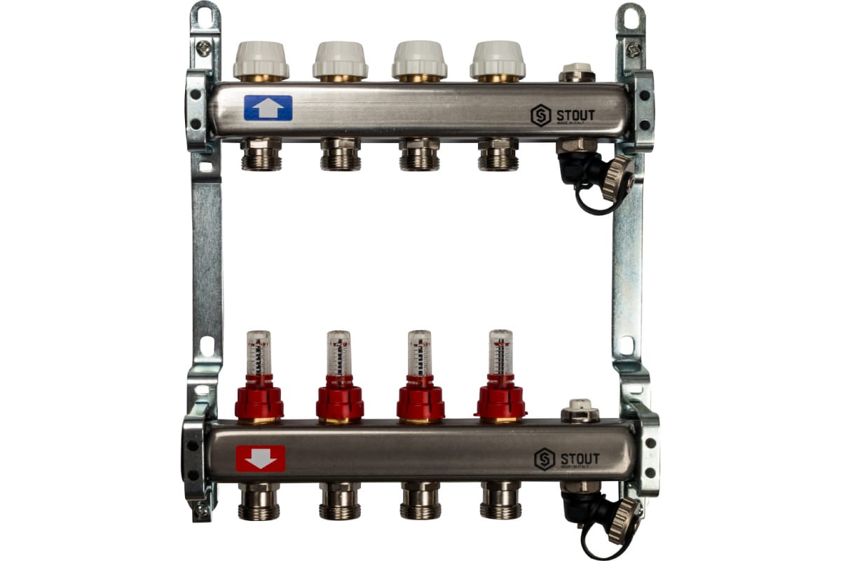 Коллекторная группа 4 отвода 1"x3/4"(18)EK с расходомерами, с клапаном вып. воздуха и сливом Stout (нерж.сталь) (SMS-0927-000004)