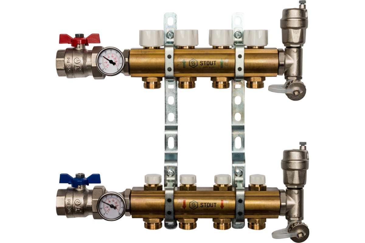 Распределительный коллектор из латуни без расходомеров STOUT SMB равномерно раздает поток теплоносителя по контурам отопительной или водоснабжающей системы. Содержит 3 контура и позволяет регулировать степень нагрева каждого контура по отдельности.