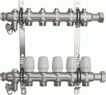 Коллекторный блок нерж.1""с накидной гайкой (настр-ми и регул.клапанами,дрен.,кронш.) 5 вых. TeRma (14245) коллекторный блок из нержавеющей стали на 5 выходов служит для распределения потоков по контурам радиаторного отопления и прочих климатических систем, где в качестве теплоносителя используется вода либо незамерзающие растворы. Выходы обратного коллектора блока оборудованы термостатическими, подающего – настроечными клапанами. Коллекторы оснащены воздухоотводчиками с отсекающими клапанами, дренажными кранами, самоуплотняющимися пробками. Стандарт присоединения трубных петель – «евроконус» на 3/4"". В комплект входят крепежные кронштейны, коллекторный блок имеет диаметр подключения 1 дюйм с внутренней резьбой.